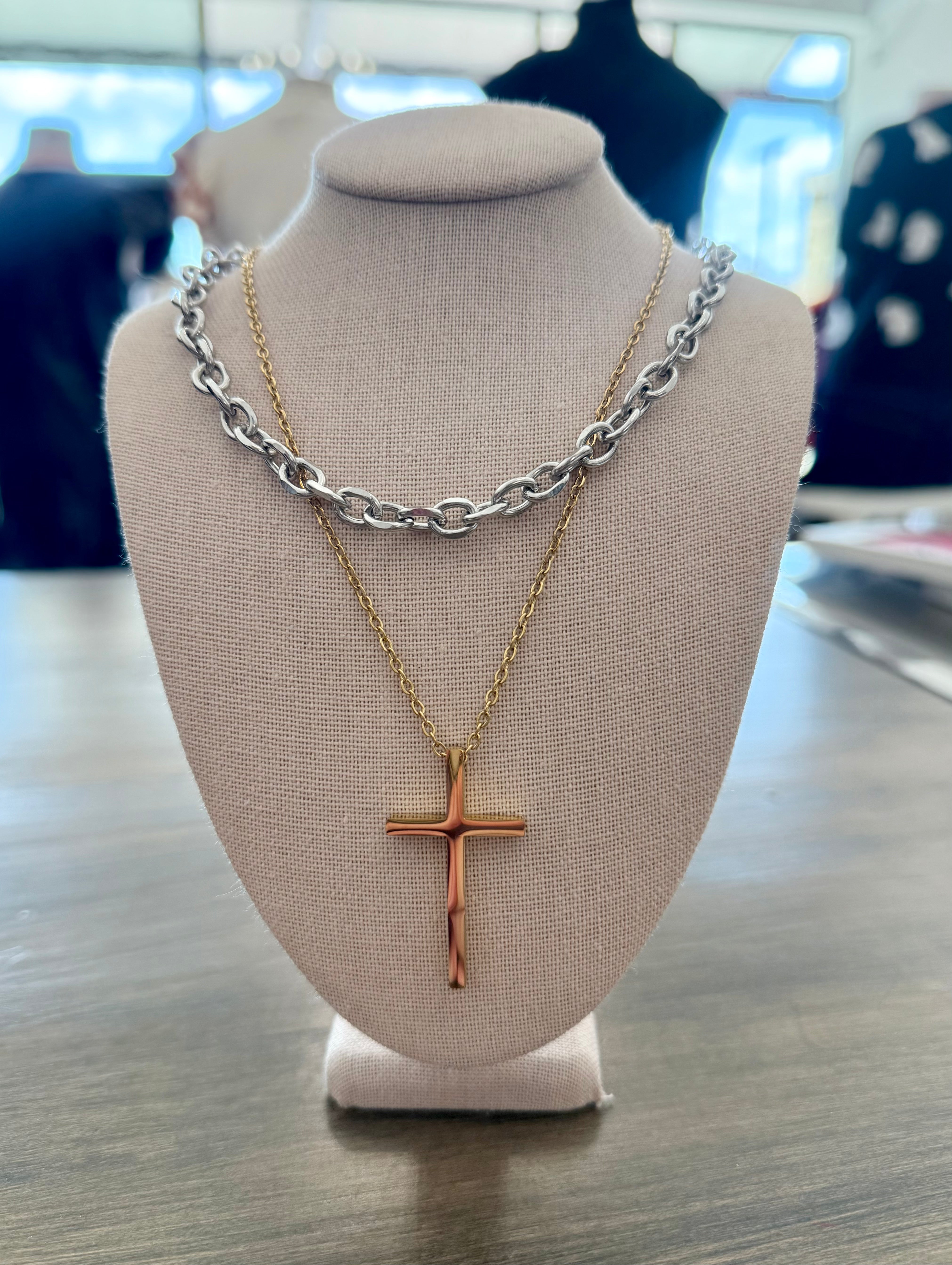 Embrace your faith with our stunning CROSS NECKLACE. This unique piece features a combination of silver and gold chains, perfectly complemented by a large gold cross pendant. Show your devotion in style and elevate any outfit with this one-of-a-kind necklace.
