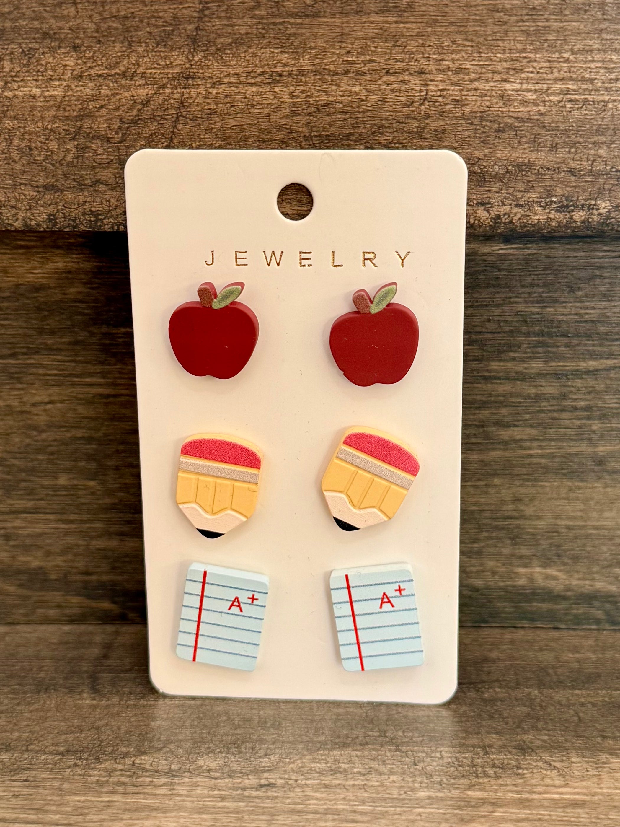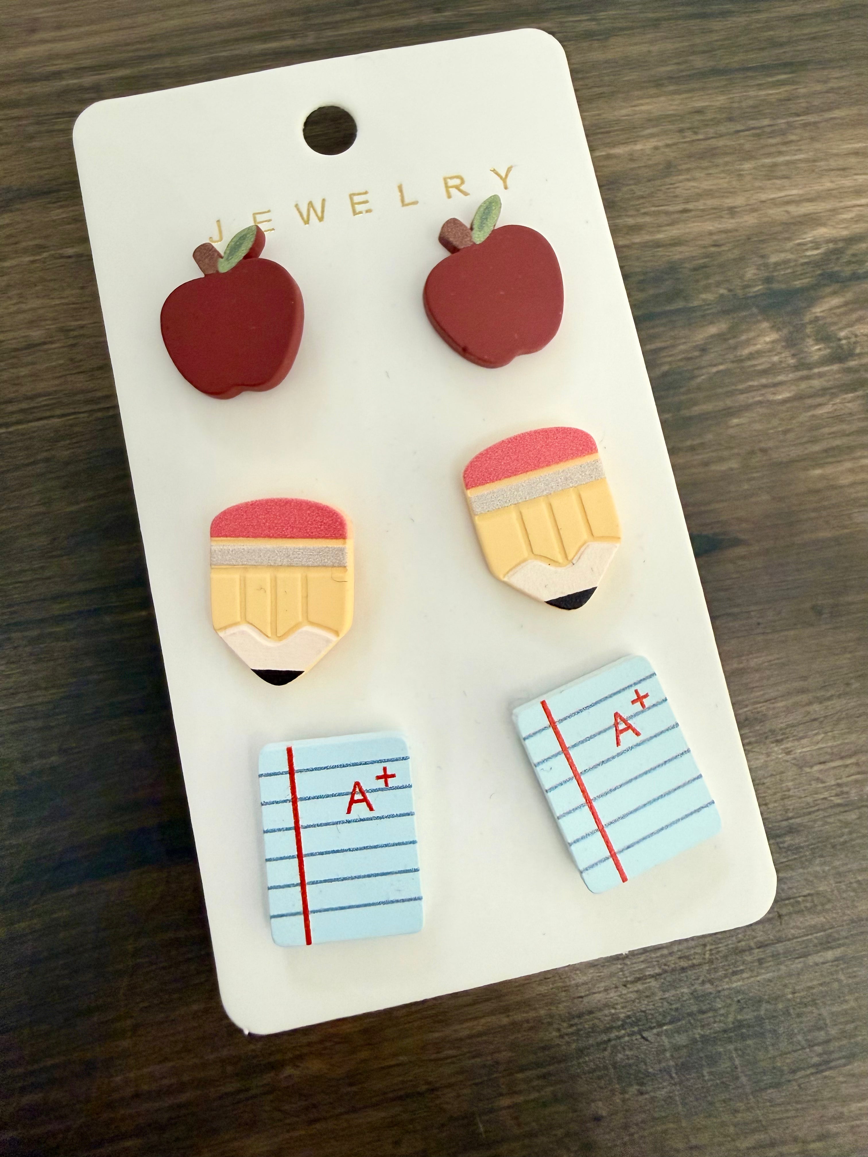 Celebrate your passion for teaching with this charming three-pair earring set, featuring playful acrylic clay designs inspired by the classroom. Each pair showcases iconic teacher symbols—a vibrant apple, a sharpened pencil, and notebook paper—crafted in lightweight, durable acrylic clay. Perfect for educators who want to express their profession with style, these versatile earrings transition seamlessly from the classroom to casual outings. Mix and match throughout your week or gift them to the teacher in your life who deserves recognition for their dedication and impact.