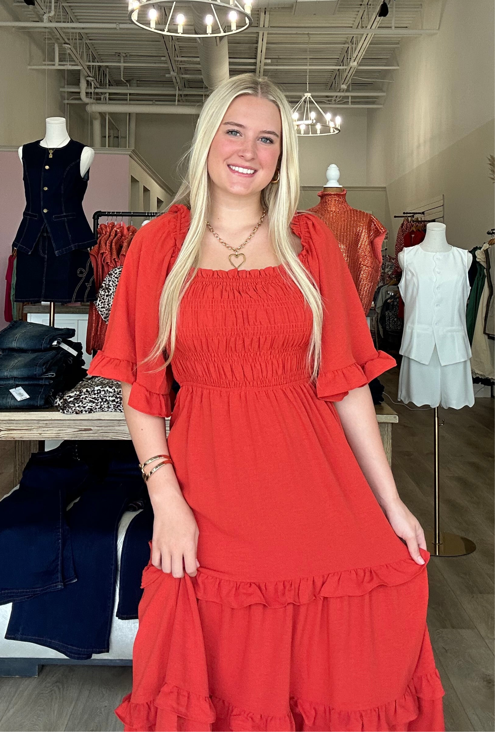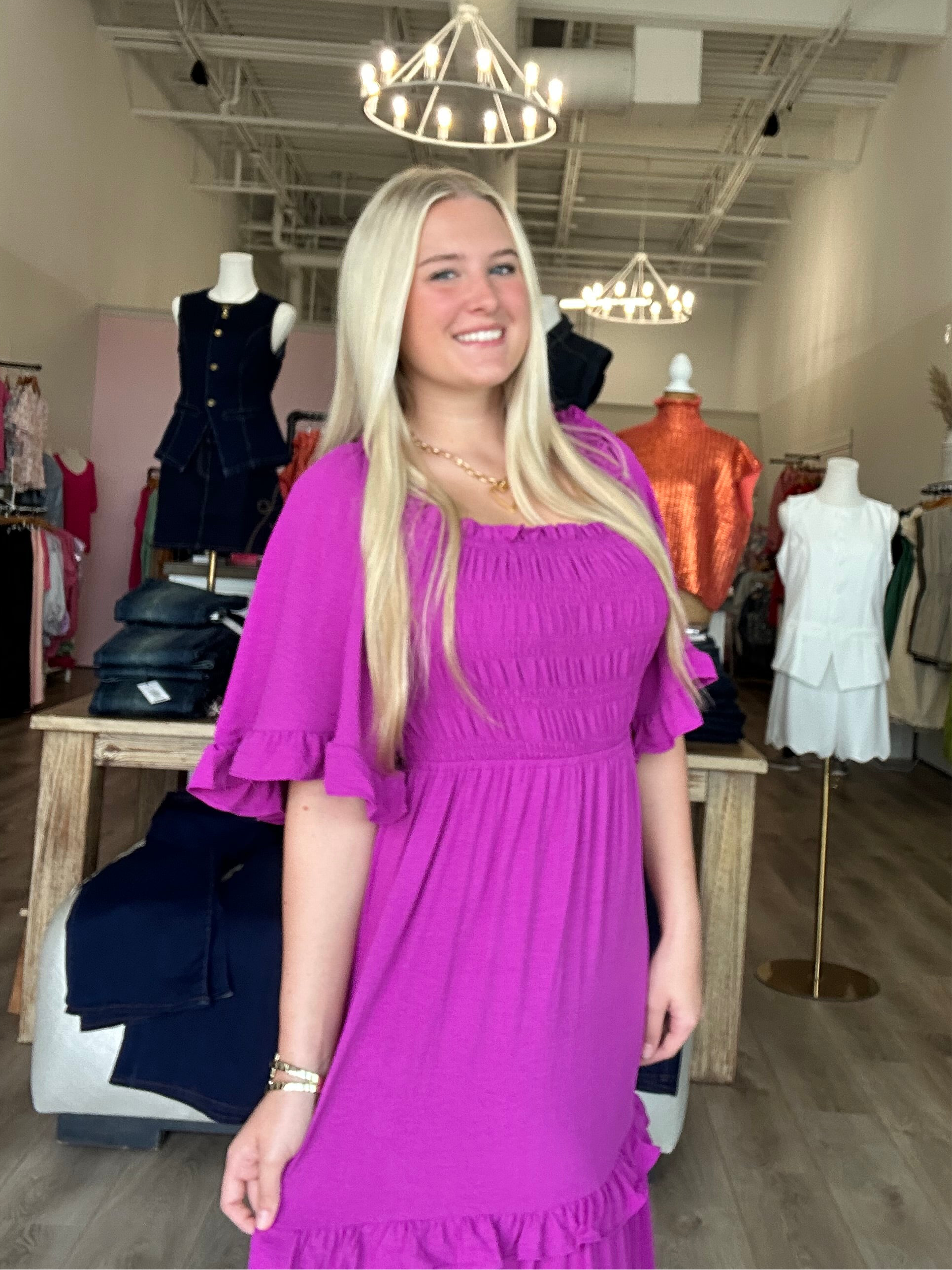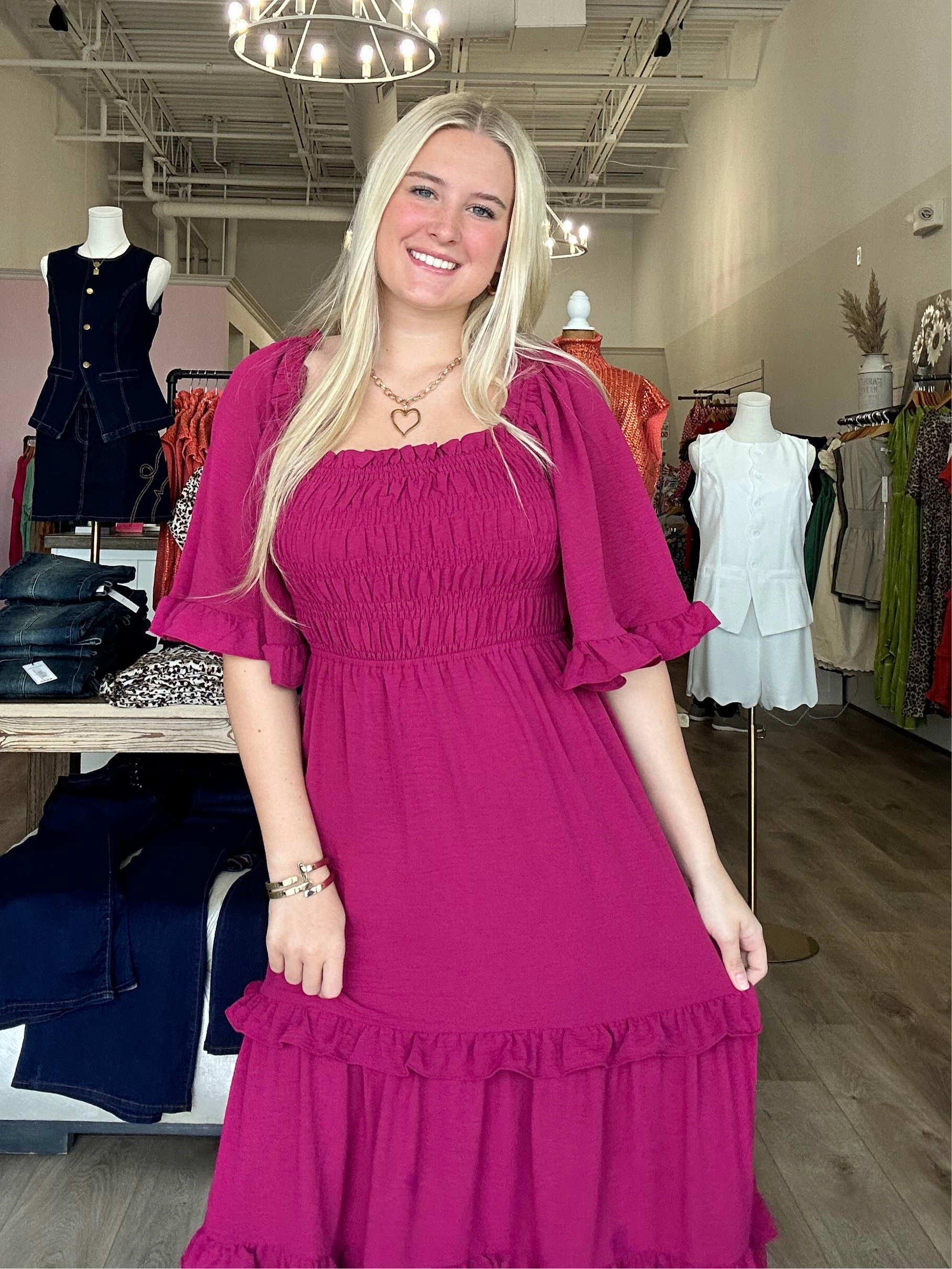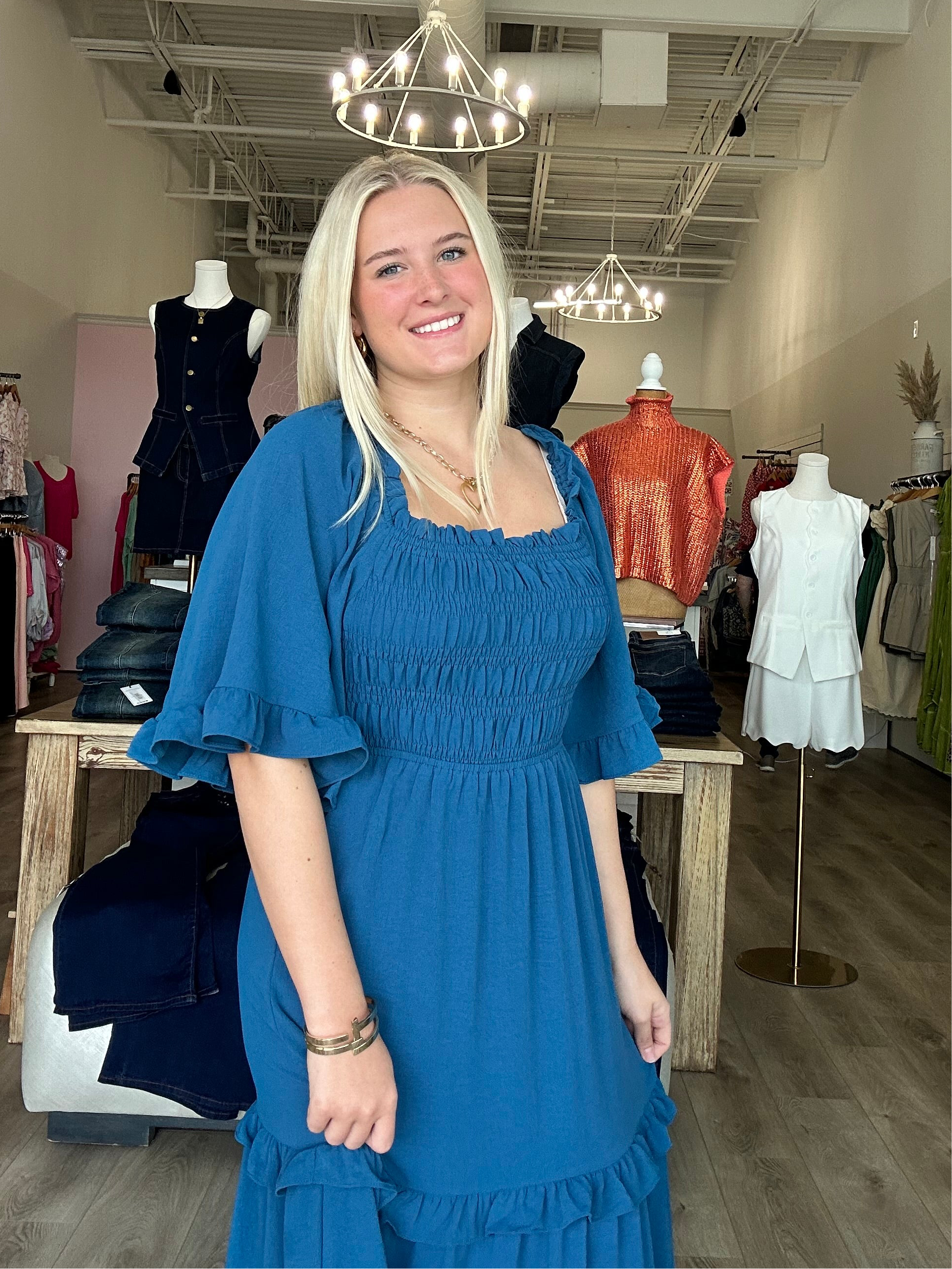 BELL SLEEVE SQUARE NECK SMOCKED TIERED MIDI DRESS