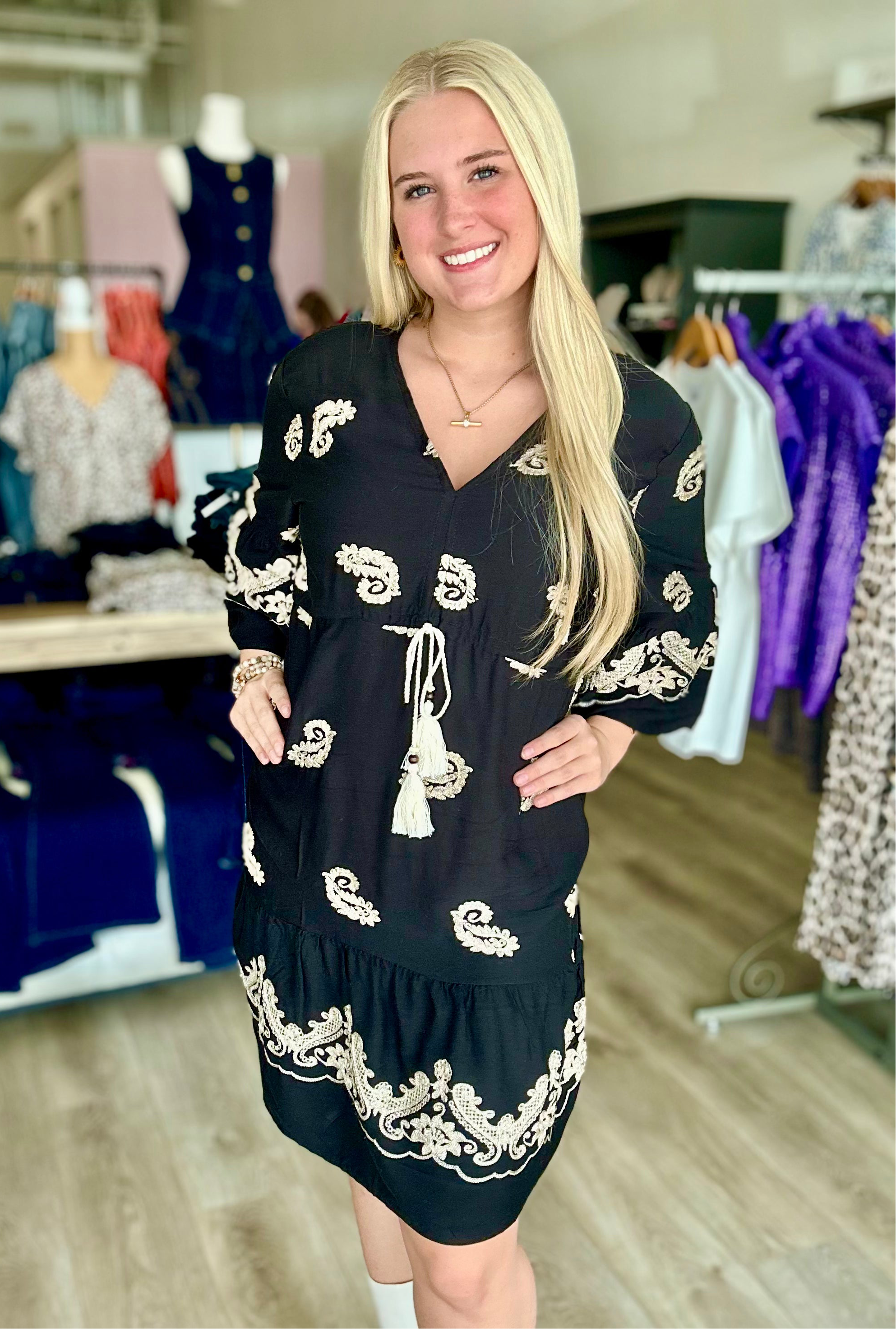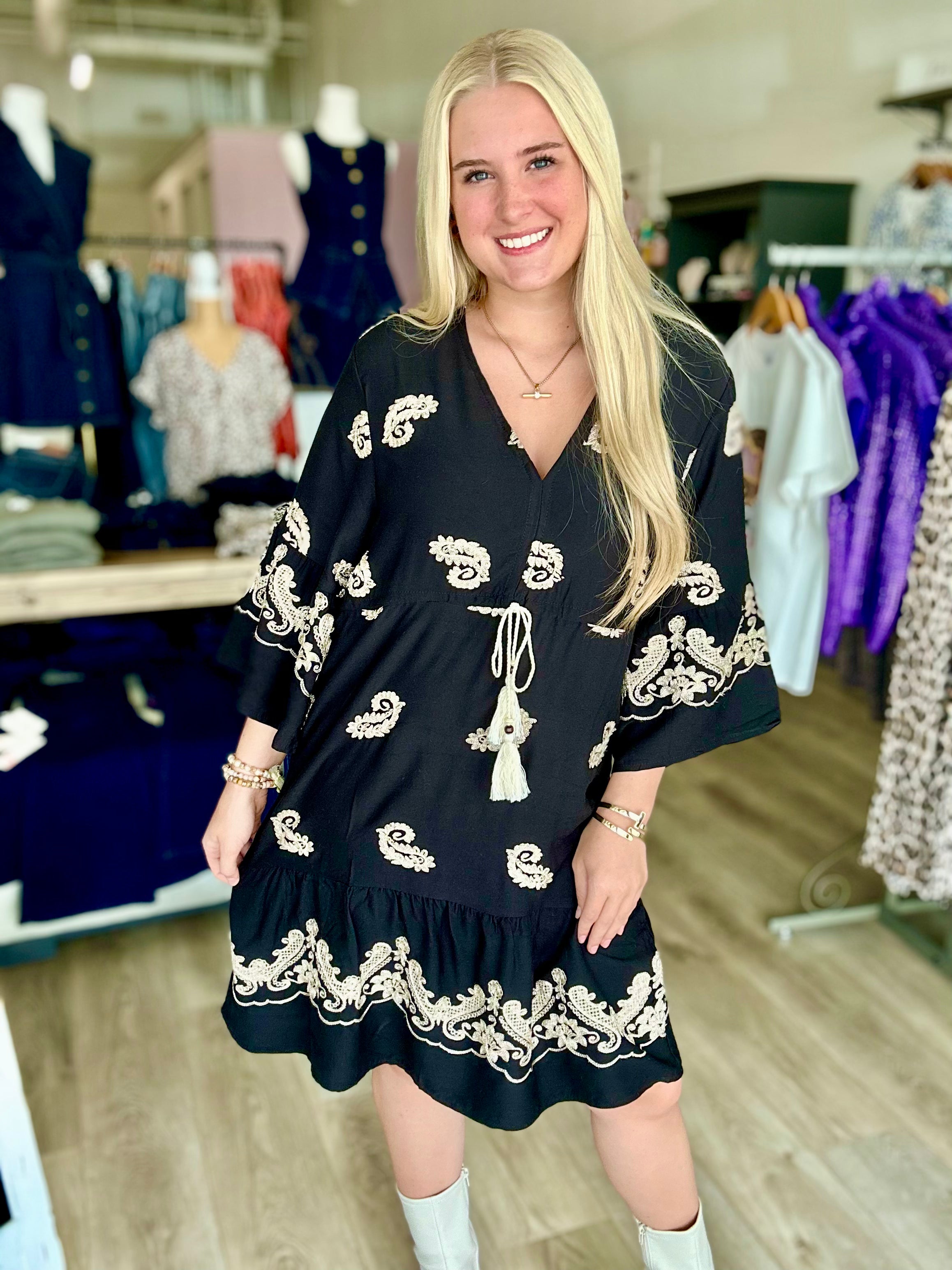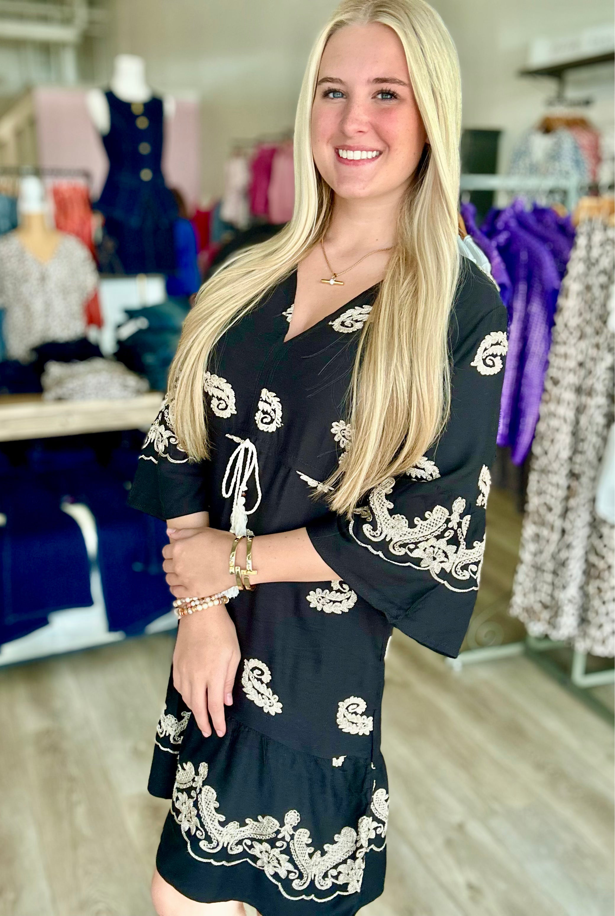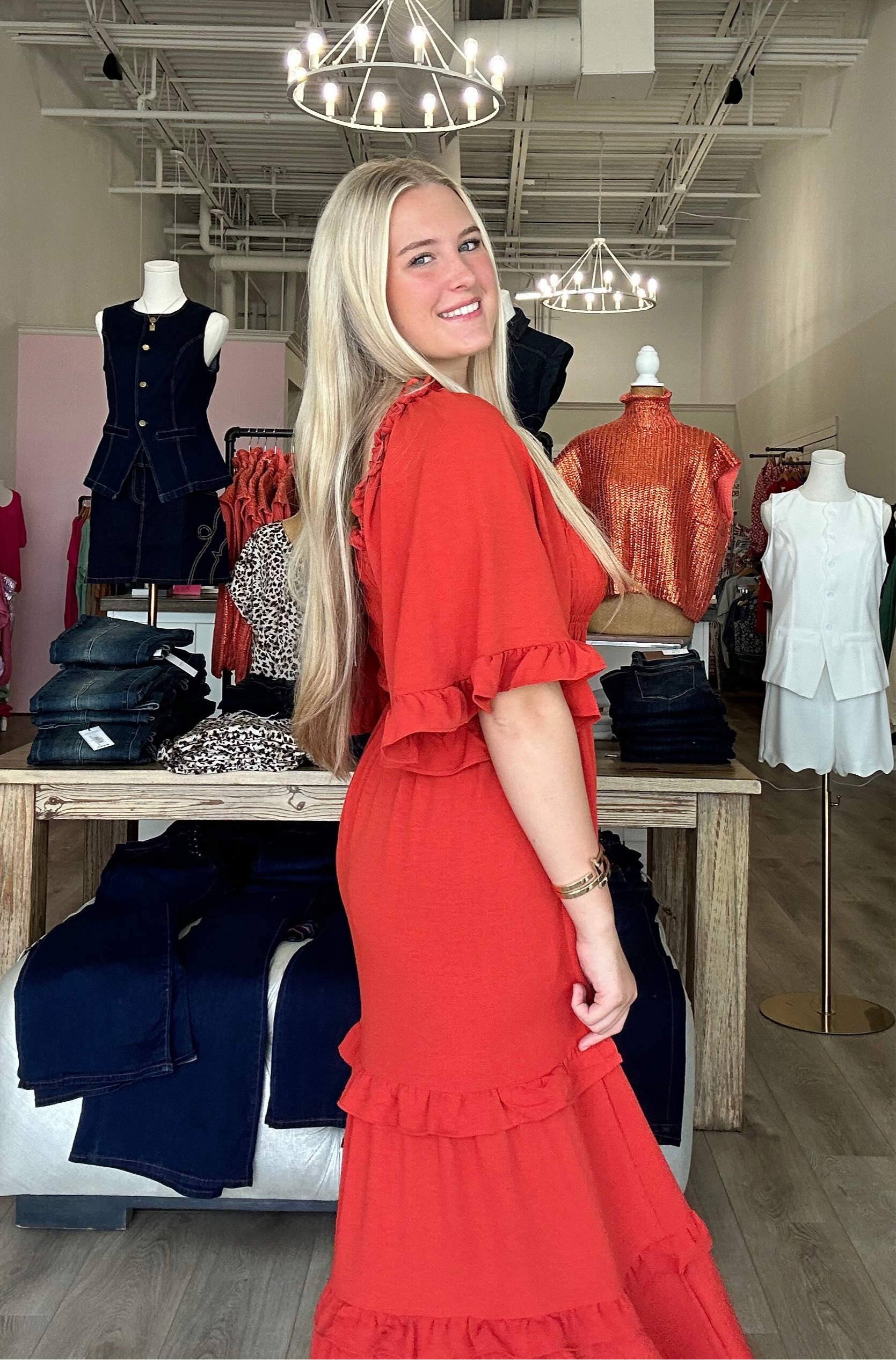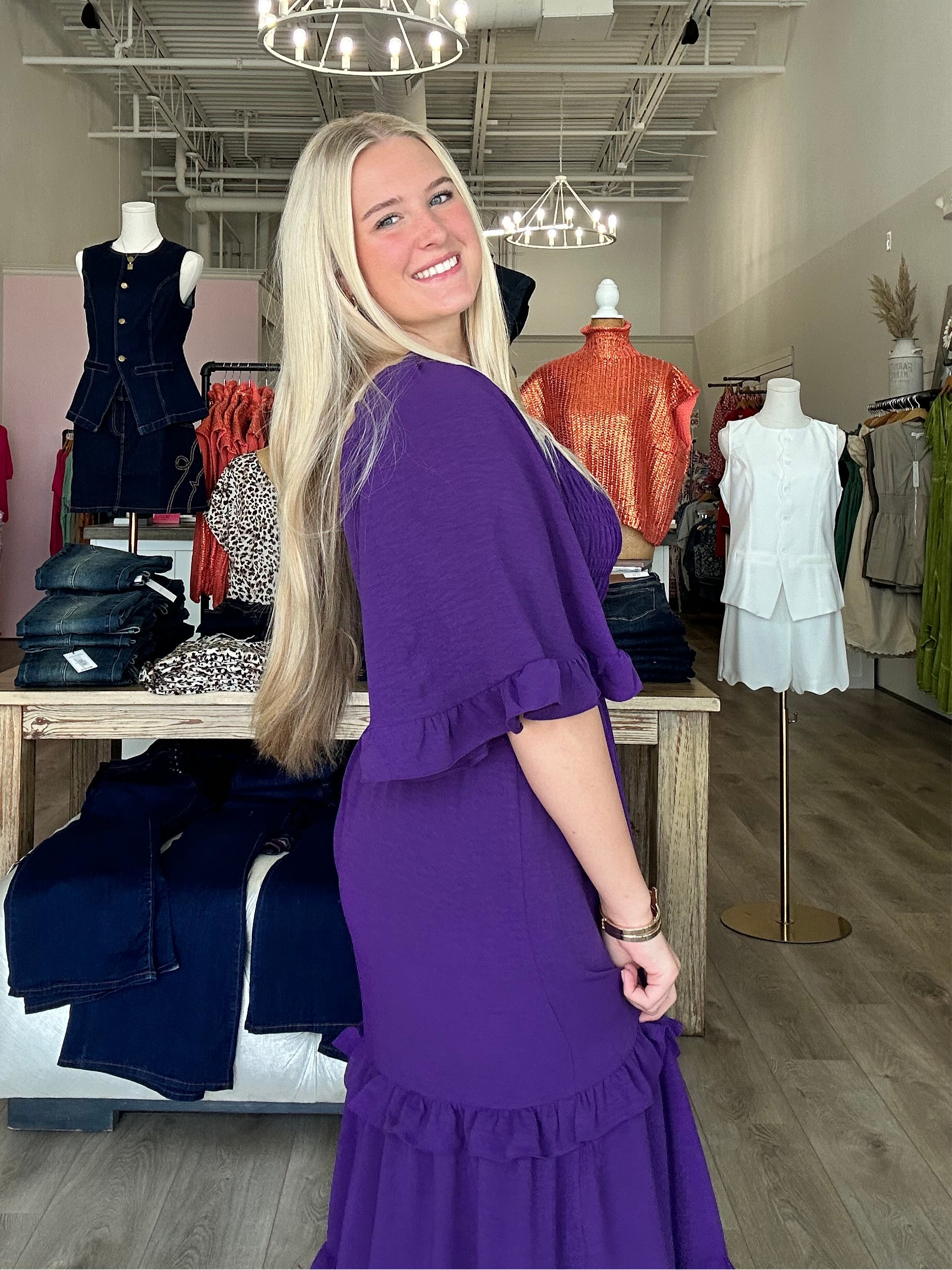 BELL SLEEVE SQUARE NECK SMOCKED TIERED MIDI DRESS