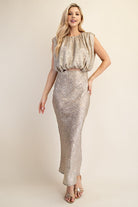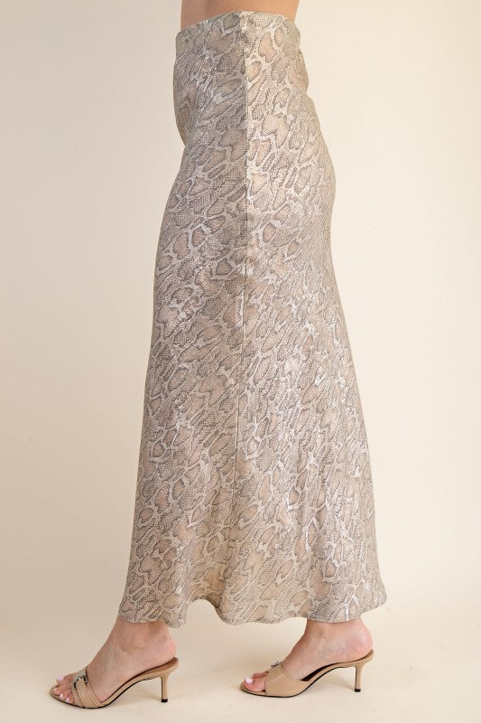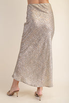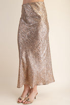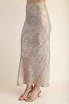 Elevate your wardrobe with this Waist Elastic Band Midi Skirt in a sophisticated beige shade featuring a striking metallic animal print. The elastic waistband ensures a comfortable, flattering fit, while the midi length offers versatile styling options for both casual and dressy occasions. Add a touch of bold elegance to your outfit with this effortlessly chic skirt.