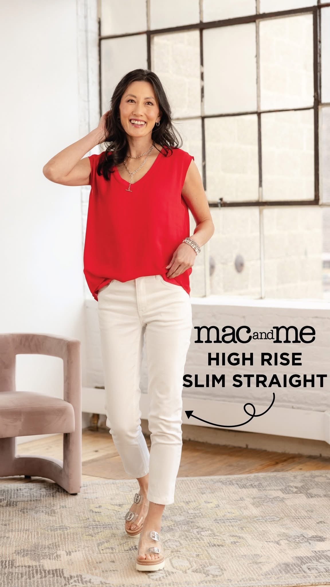 Elevate your style with Mac and Me's "AB" Solution High Rise Slim Straight jeans in crisp Optic White. With a slim and straight silhouette, these jeans enhance your figure while providing a versatile and polished look. Perfect for any occasion, these jeans are a must-have for your wardrobe.