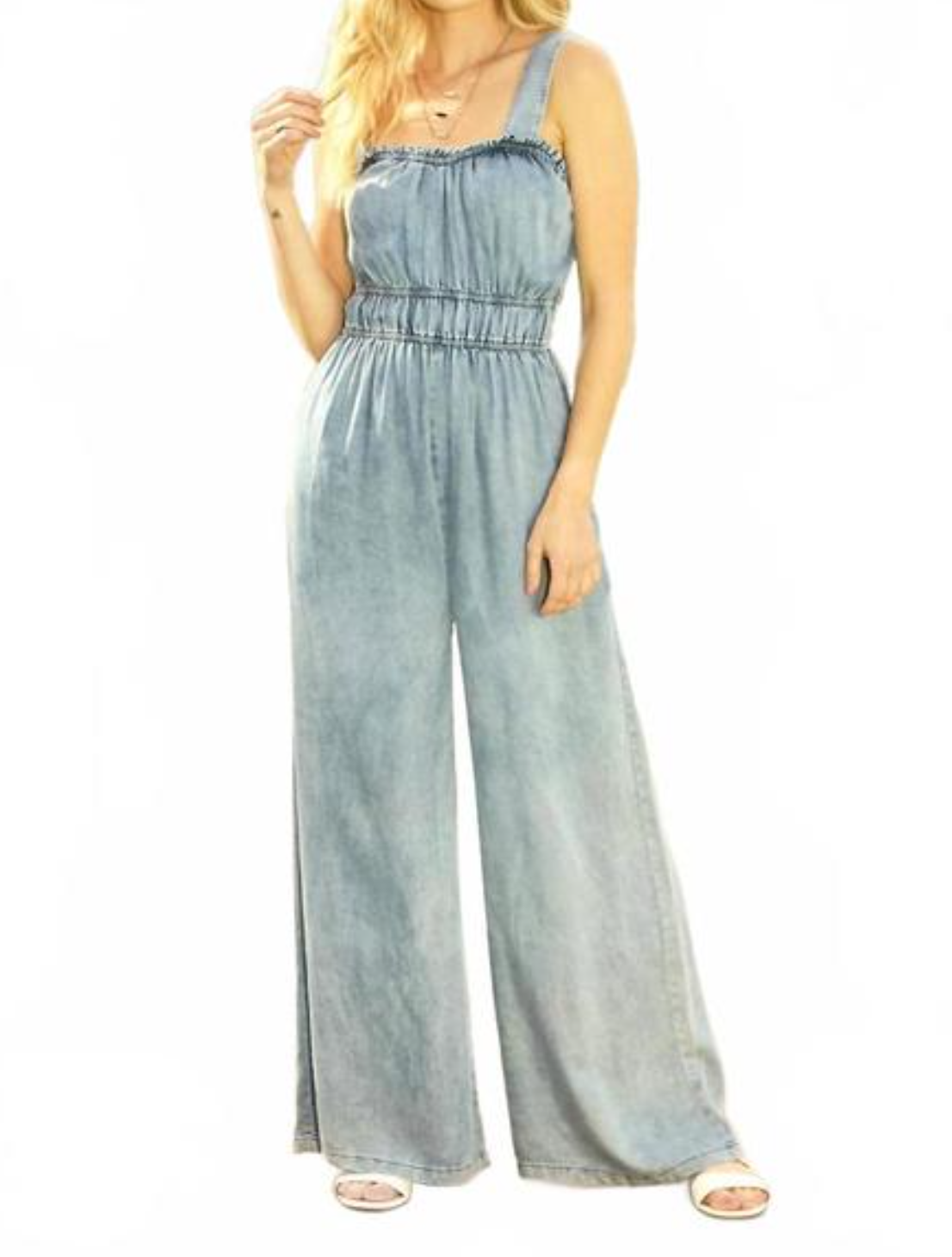 The Washed Denim Tencel Jumpsuit is a versatile wardrobe staple that combines comfort with effortless style. With its flattering smocked fit and relaxed wide-leg silhouette, it’s the perfect statement piece for any season.