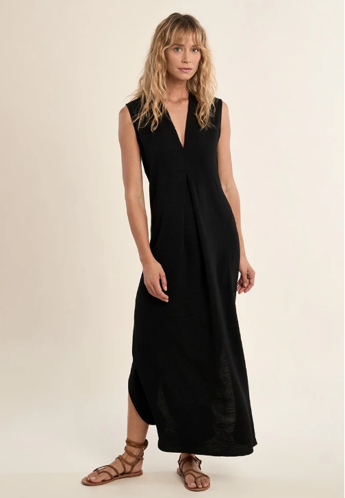The flattering V-neckline maxi dress elongates the neckline while the sleeveless silhouette keeps it fresh and versatile. Crafted in a lightweight, fluid woven fabric, this piece offers an easy, breathable feel that’s perfect for warm days or layering into cooler seasons.