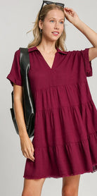 This Linen Folded Sleeve Tiered Dress in rich Merlot is perfect for any occasion. Made with a comfortable linen blend, it features a stylish collared V-neck and a frayed hem for a touch of edge. Elevate your wardrobe with this versatile and chic dress.