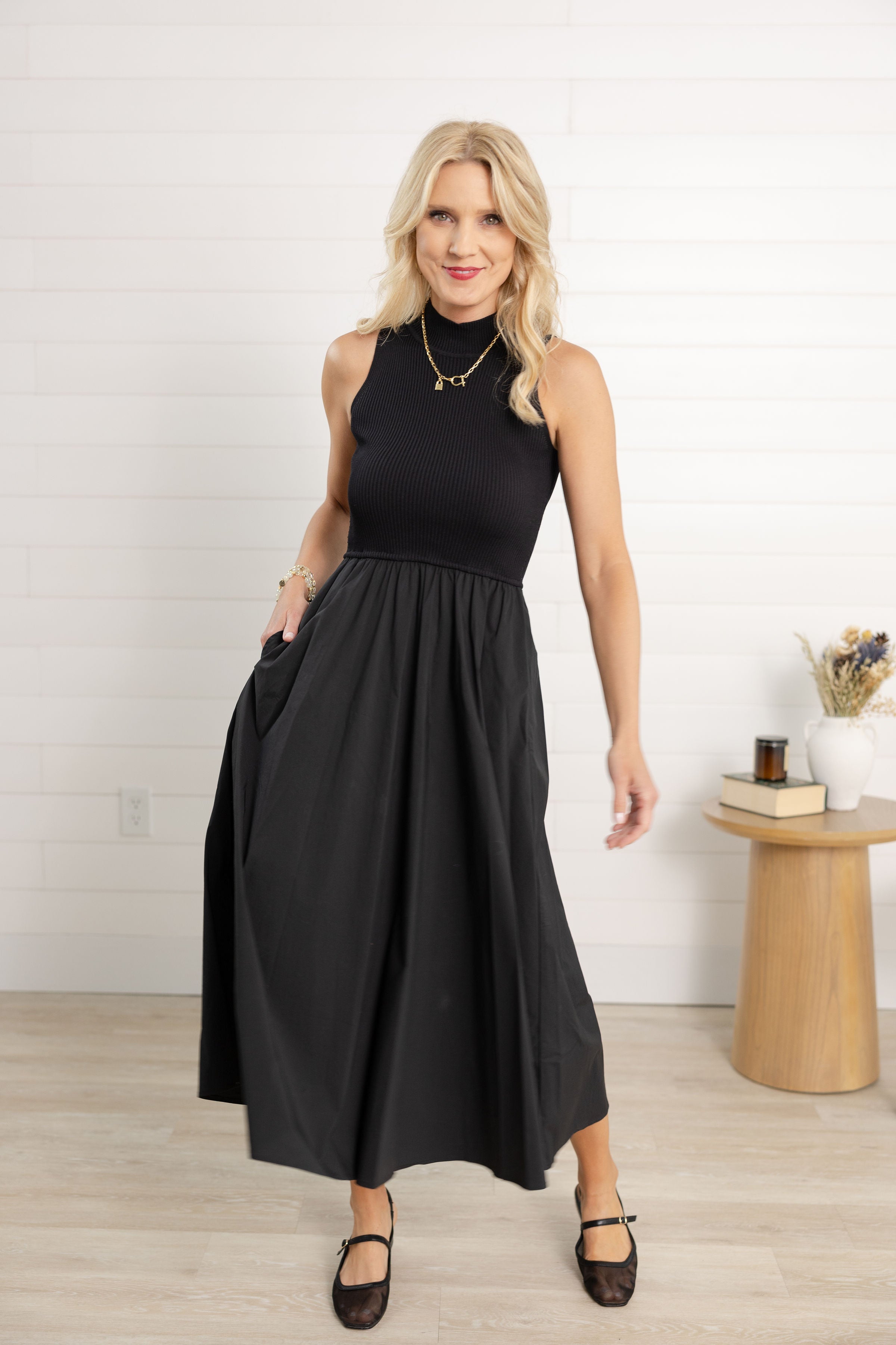 Elevate your style effortlessly with this sleeveless maxi dress in classic black. Featuring a stretchy mock neck top that hugs comfortably and a flowy bottom that moves gracefully, it’s designed for all-day ease. Convenient pockets add a practical touch without sacrificing elegance, making it perfect for versatile wear from day to night.