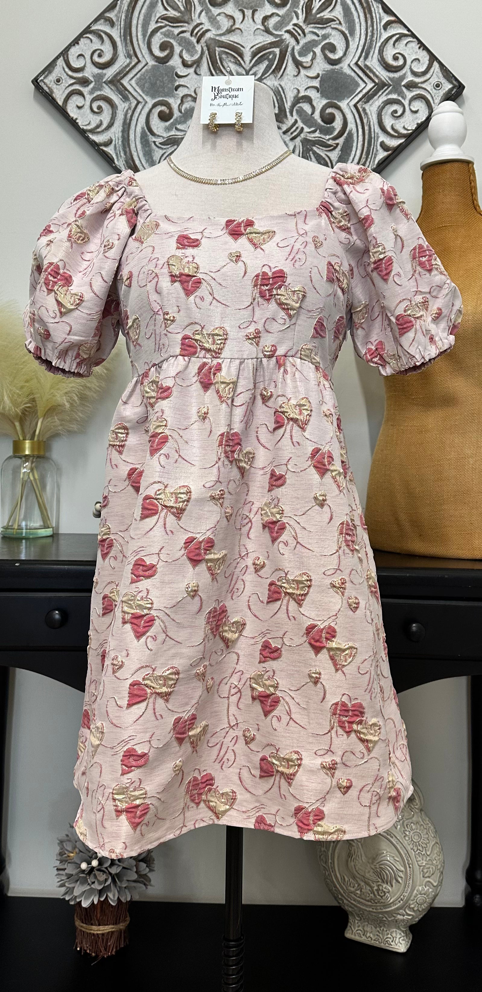 Our Metallic Heart Dress is designed to shimmer just enough to turn heads without trying too hard (because effort is overrated). Soft pink tones are paired with delicate metallic heart accents that catch the light beautifully, giving this dress that special occasion energy while still feeling wearable.