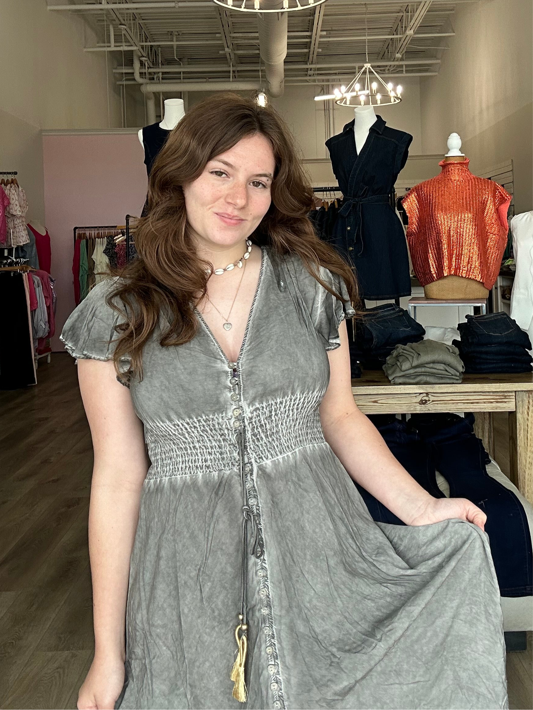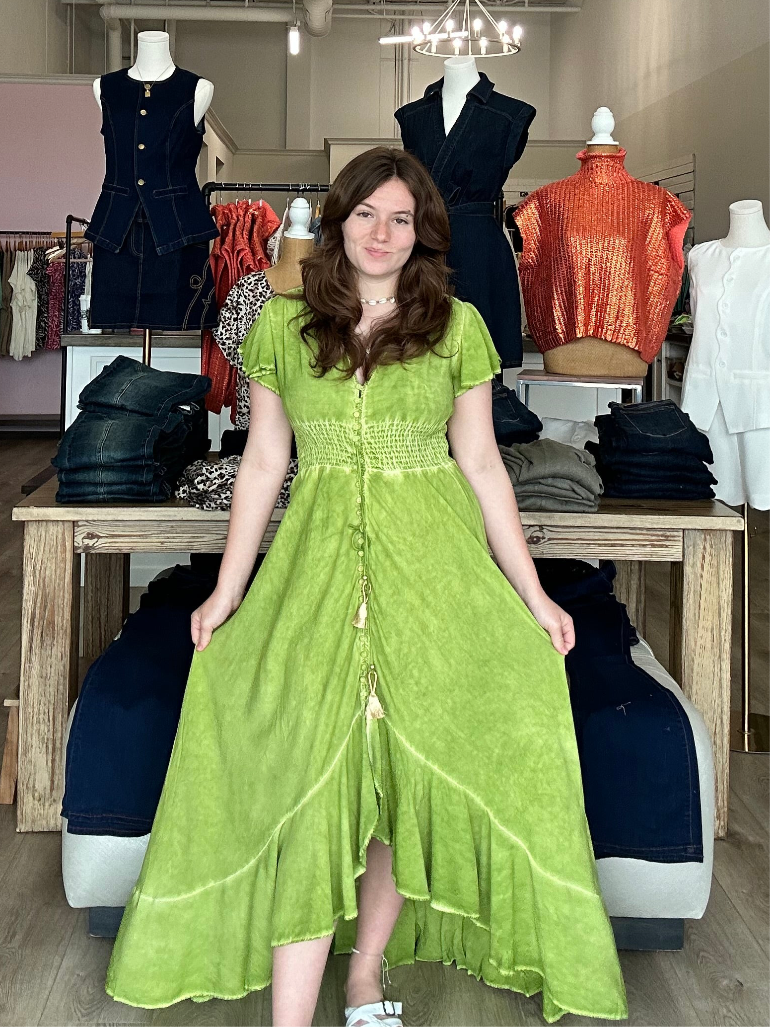 Experience the beauty of nature with our Mineral Wash Butterfly Sleeve High Low Maxi Dress. The unique mineral wash creates a stunning green and charcoal color, while the butterfly sleeves and high-low hem add a touch of whimsy. Make a statement and elevate your style with this maxi dress.