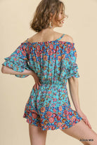 Mixed Floral Border Print Ruffle Sleeve Off Shoulder Spaghetti Strap Romper