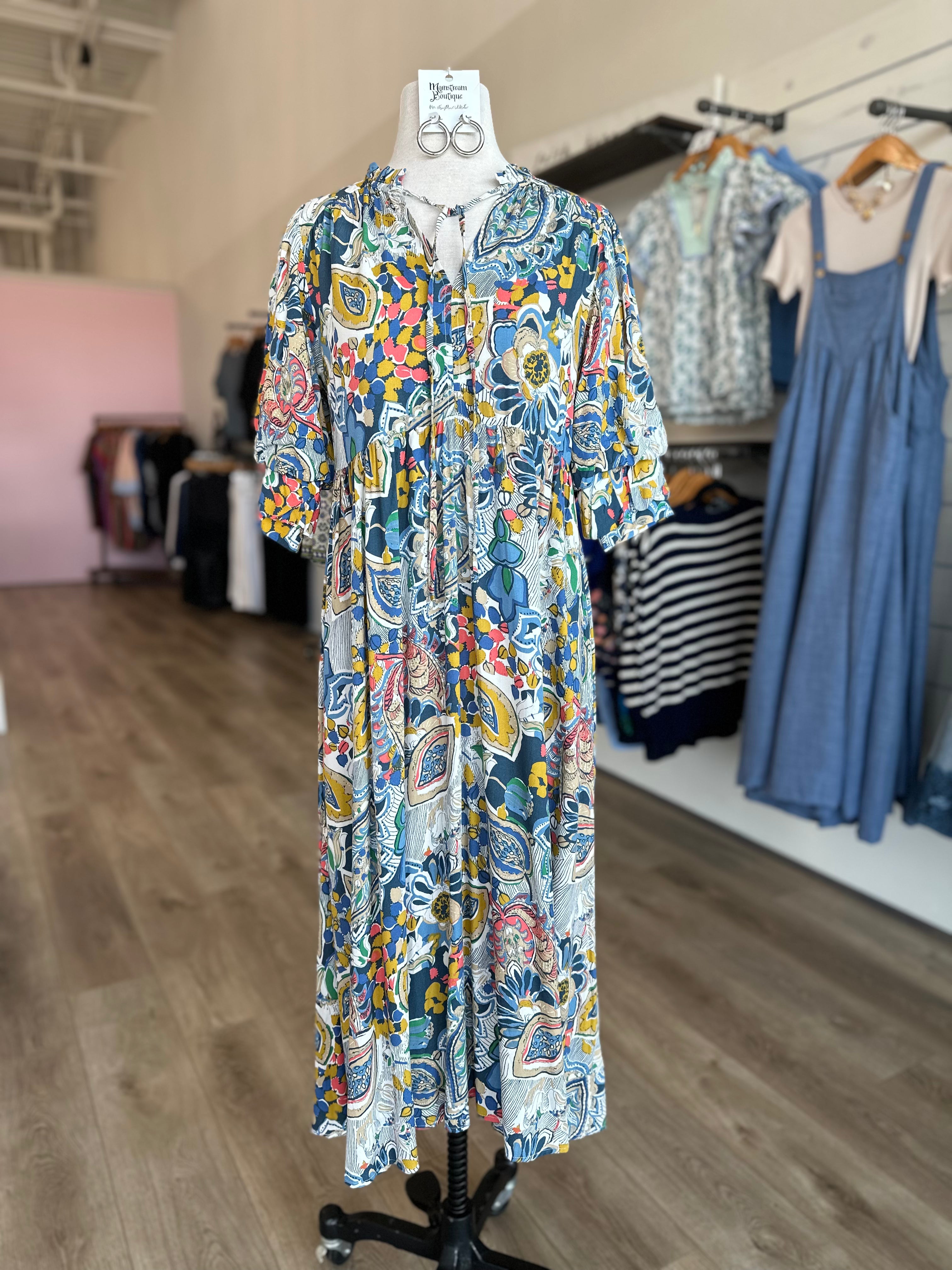 Stay stylish and comfortable in this paisley print midi dress! Featuring a flattering A-line silhouette, tiered design, and 3/4 puff sleeves, this dress is perfect for any occasion. The tie detail adds a touch of elegance while the lightweight fabric keeps you cool and chic.