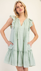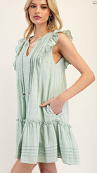 Step into sweet and playful style with our Ruffle Drawstring V-Neck Mini Dress! This short sleeve mini dress features a flattering V-neckline with a drawstring tie closure, adding a touch of elegance and versatility. The pintuck accents and fluttery ruffled sleeves create a feminine and charming look. Complete with two side hip pockets and a tiered hemline, this dress offers practicality and a flowy silhouette perfect for any occasion.