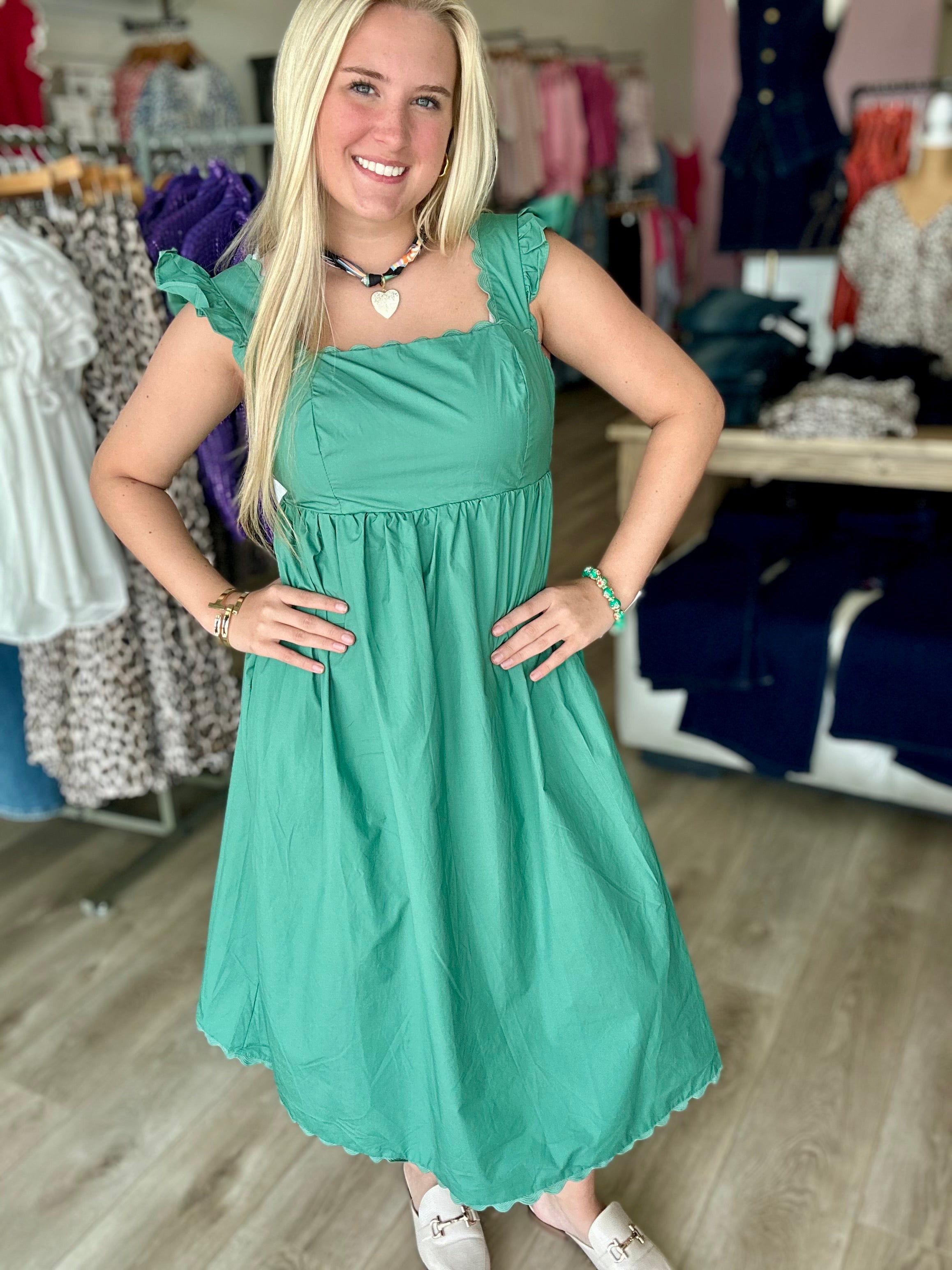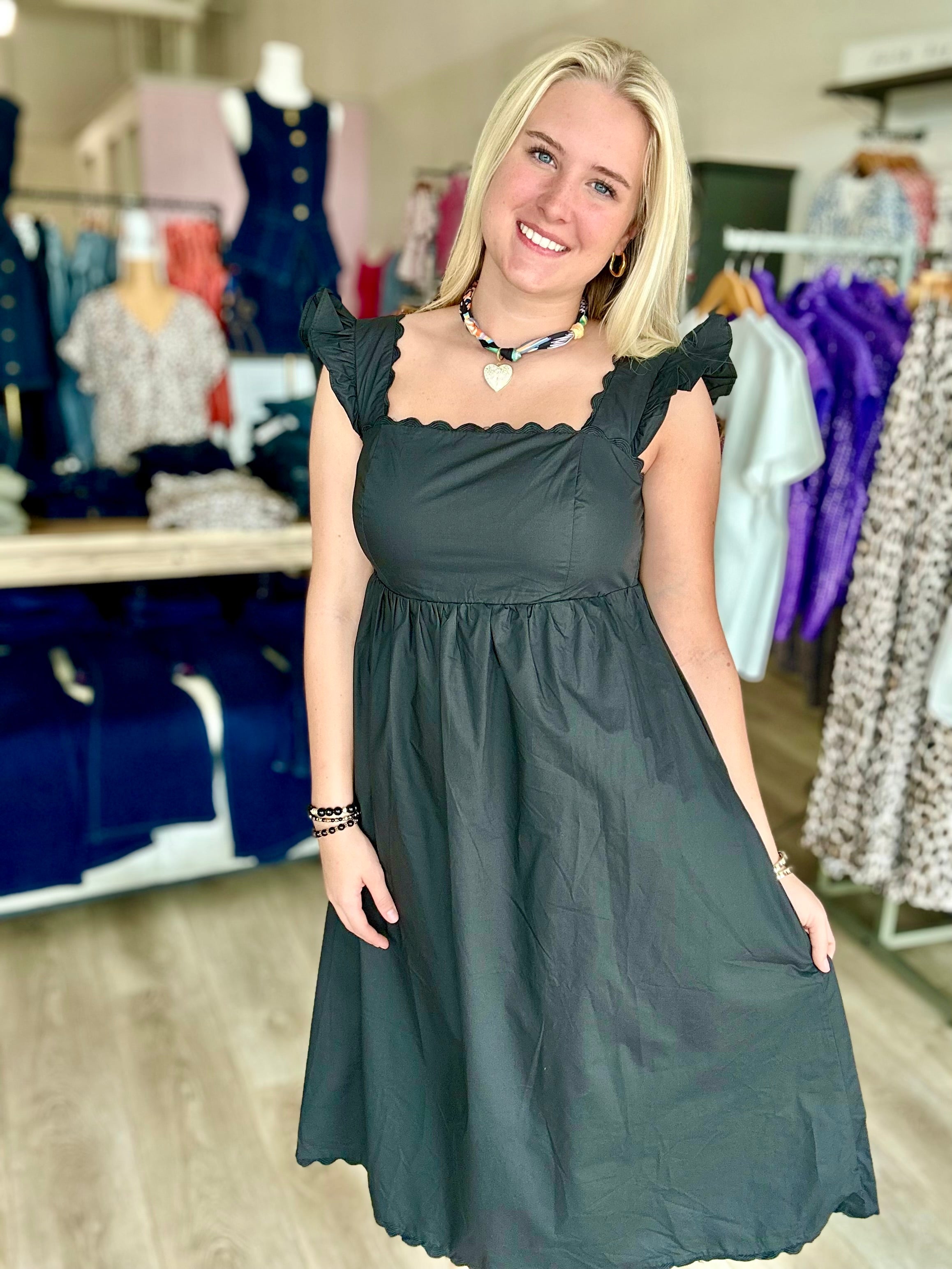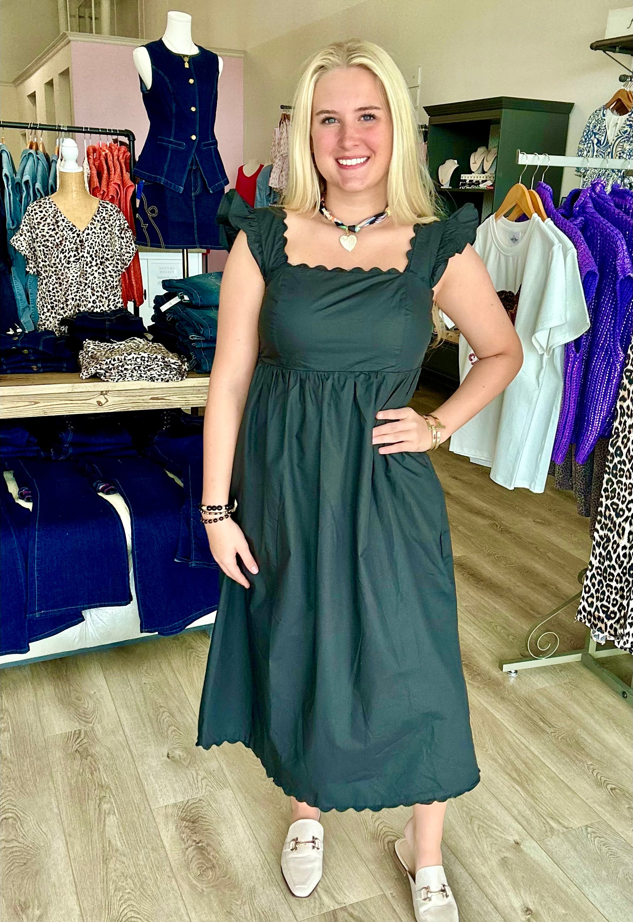 Effortlessly elegant and functional, this Scallop Midi Dress is a must-have for any wardrobe! The dress features charming scalloped edges and functional pockets, making it both stylish and practical. Available in three beautiful colors - beige, black, and green. Add this versatile piece to your collection and elevate your style!