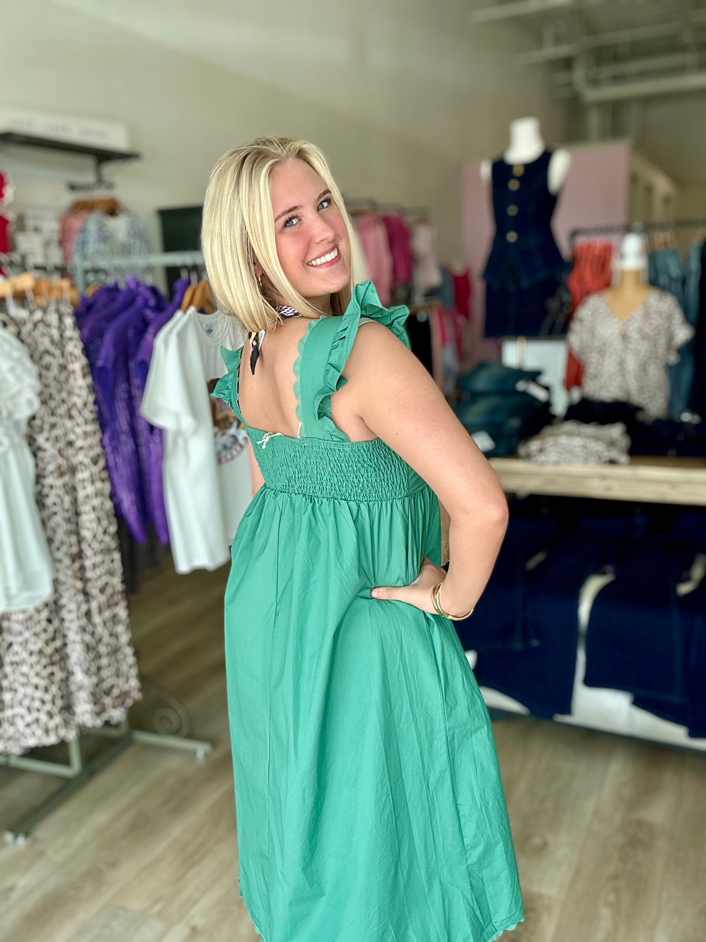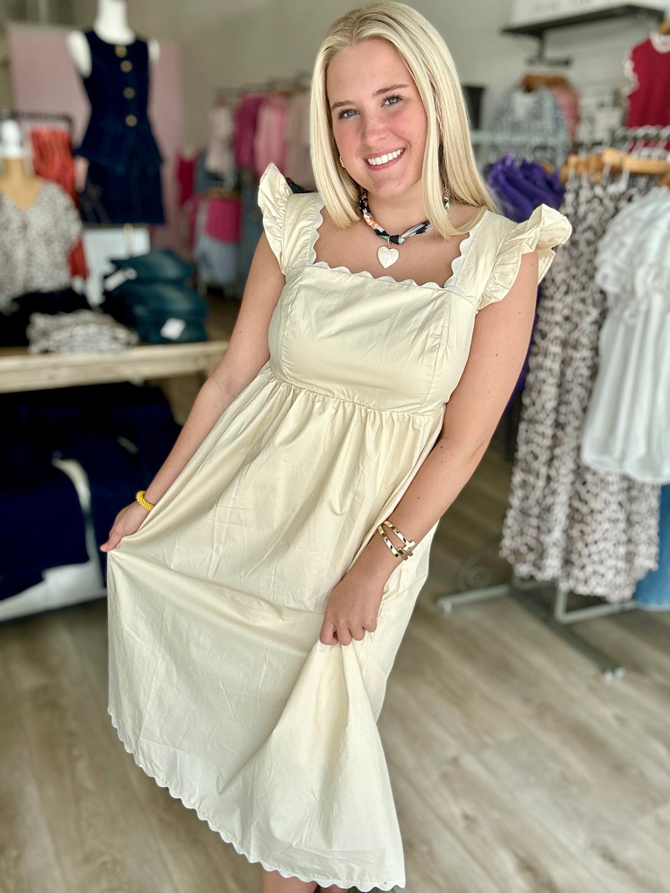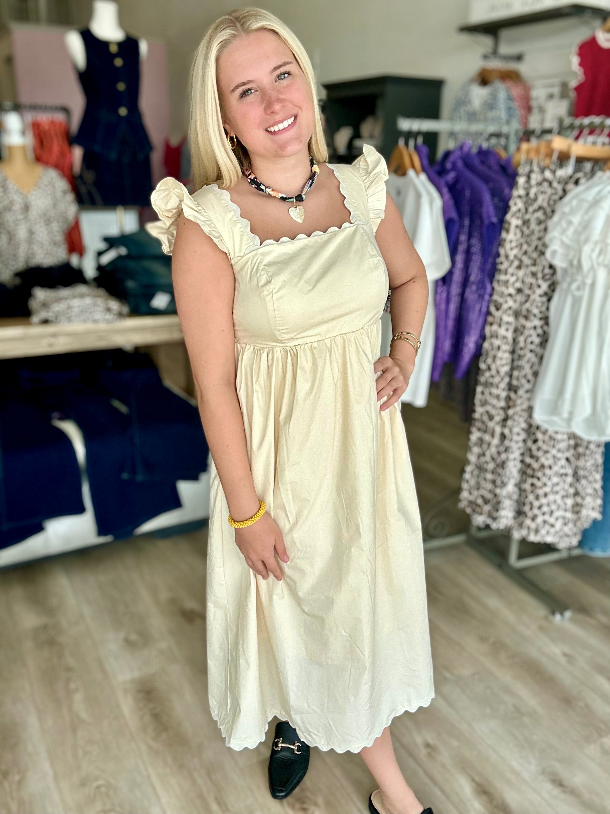 Effortlessly elegant and functional, this Scallop Midi Dress is a must-have for any wardrobe! The dress features charming scalloped edges and functional pockets, making it both stylish and practical. Available in three beautiful colors - beige, black, and green. Add this versatile piece to your collection and elevate your style!