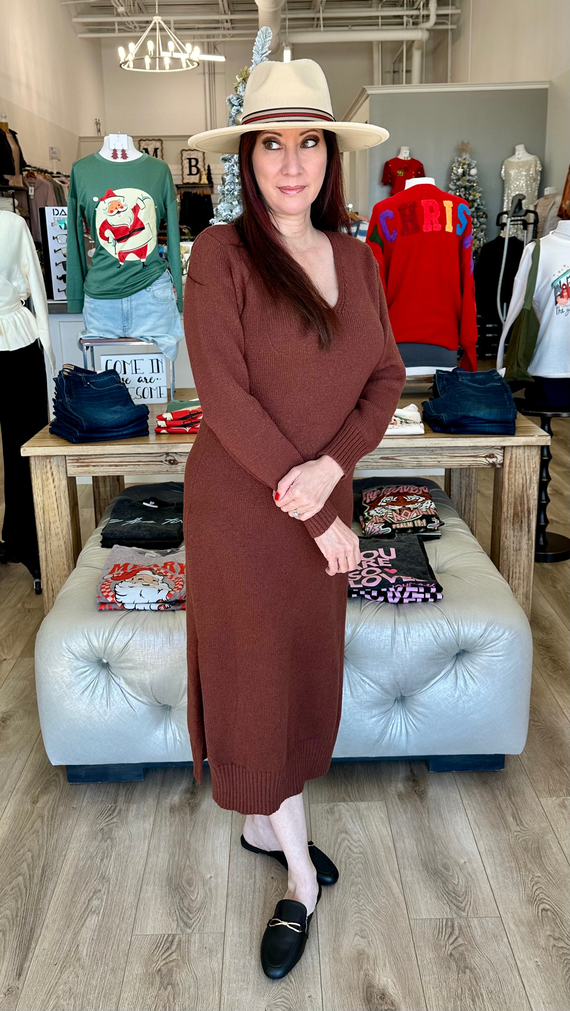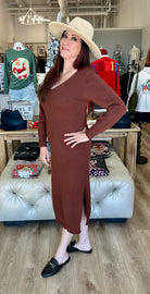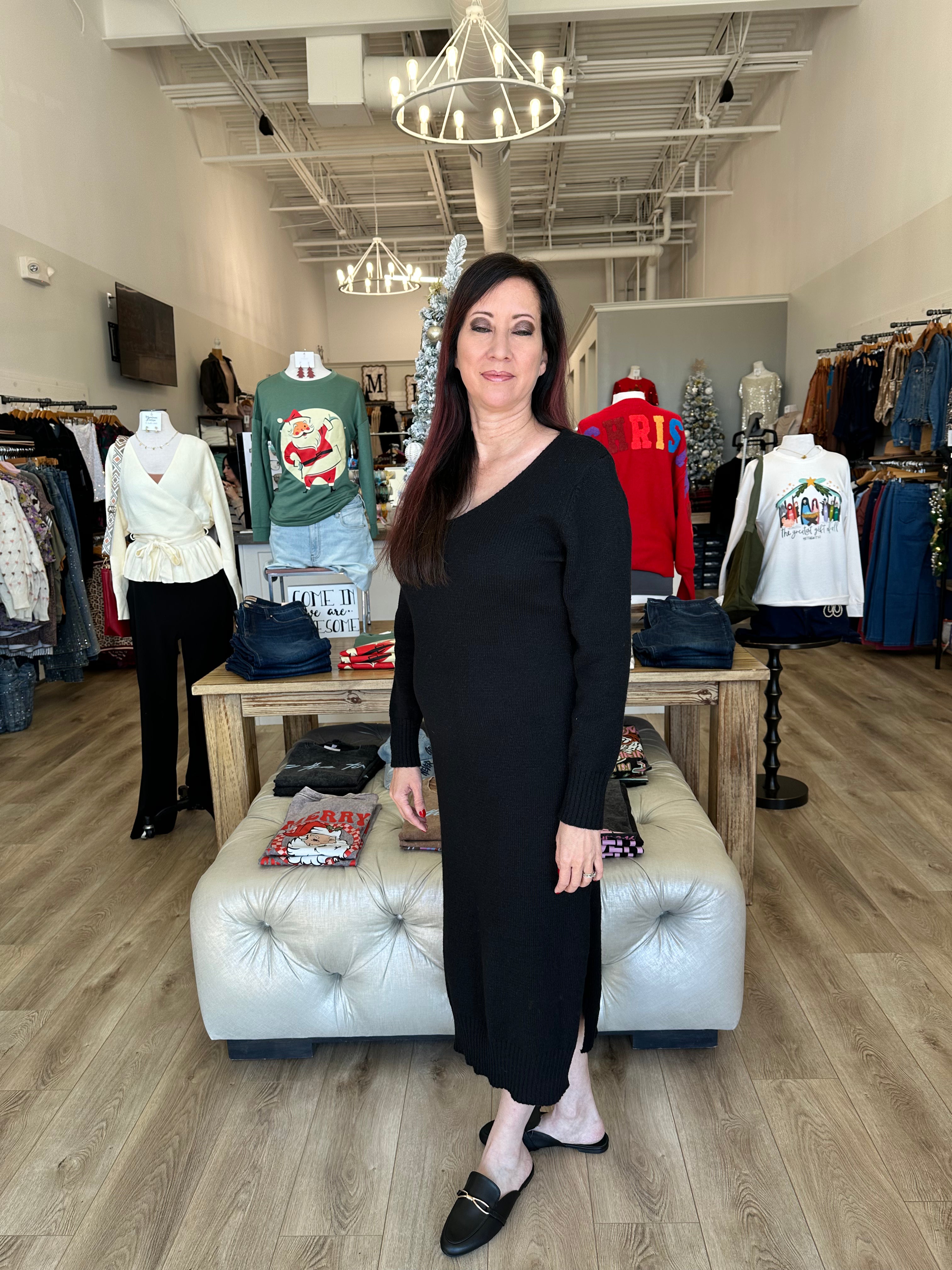 Upgrade your wardrobe with our V-NECK KNIT SWEATER DRESS! This versatile dress is perfect for any occasion, with a trendy v-neck design and comfortable knit fabric. Look and feel your best in this must-have dress that will keep you warm and stylish throughout the season. Don't miss out on this essential addition to your closet!