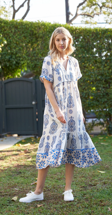 V-Neck Mixed Print Midi Dress with Piping Details
