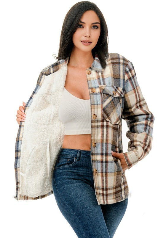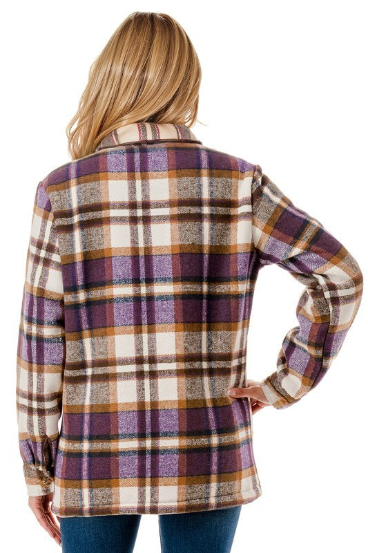Layer up in cozy style with this fur-lined plaid flannel shacket—the perfect hybrid piece that transitions seamlessly from casual to polished. Choose between rich purple plaid or cool blue plaid to match your vibe. Soft fur lining keeps you warm without the bulk, while functional pockets add everyday practicality. Versatile enough to throw over anything, this shacket is your new go-to for effortless, comfortable style.