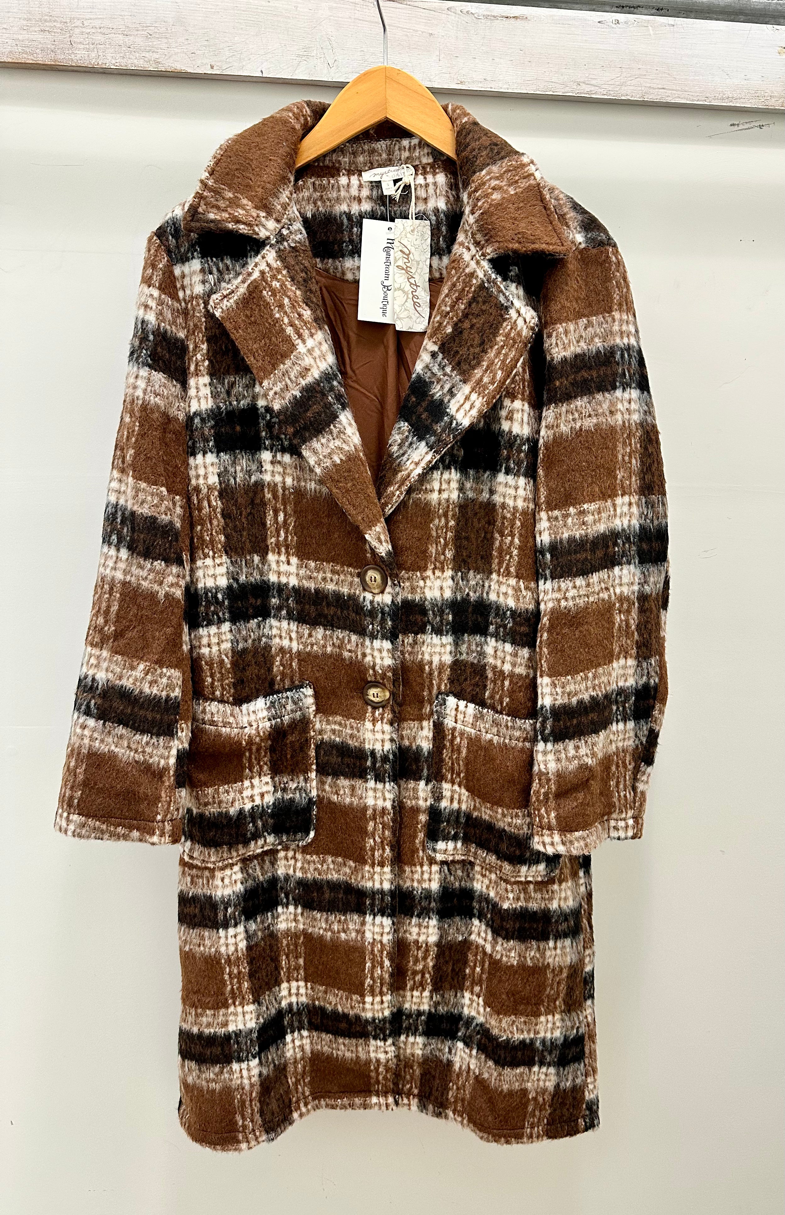 Elevate your outerwear with the Plaid Long Coat, available in versatile mocha and navy shades. Its classic plaid pattern and extended length offer timeless style and added warmth, making it perfect for layering during cooler days. Designed to complement any outfit, this coat combines sophistication with comfort for a polished, confident look wherever you go.