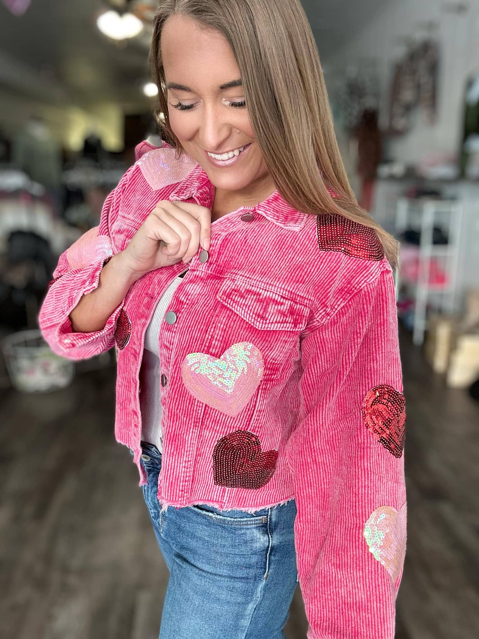 Celebrate love in style with this charming Sequin Heart Corduroy Shacket. Crafted from soft, mineral-washed red corduroy, this cropped shacket features eye-catching sequin-stitched heart patches that make a bold Valentine's statement. The perfect layering piece for the season, it combines playful romance with everyday versatility. Whether you're dressing up for date night or keeping it casual, this shacket adds instant charm and personality to any outfit. Don't miss out—these are ready to ship and perfect for spreading the love this February.