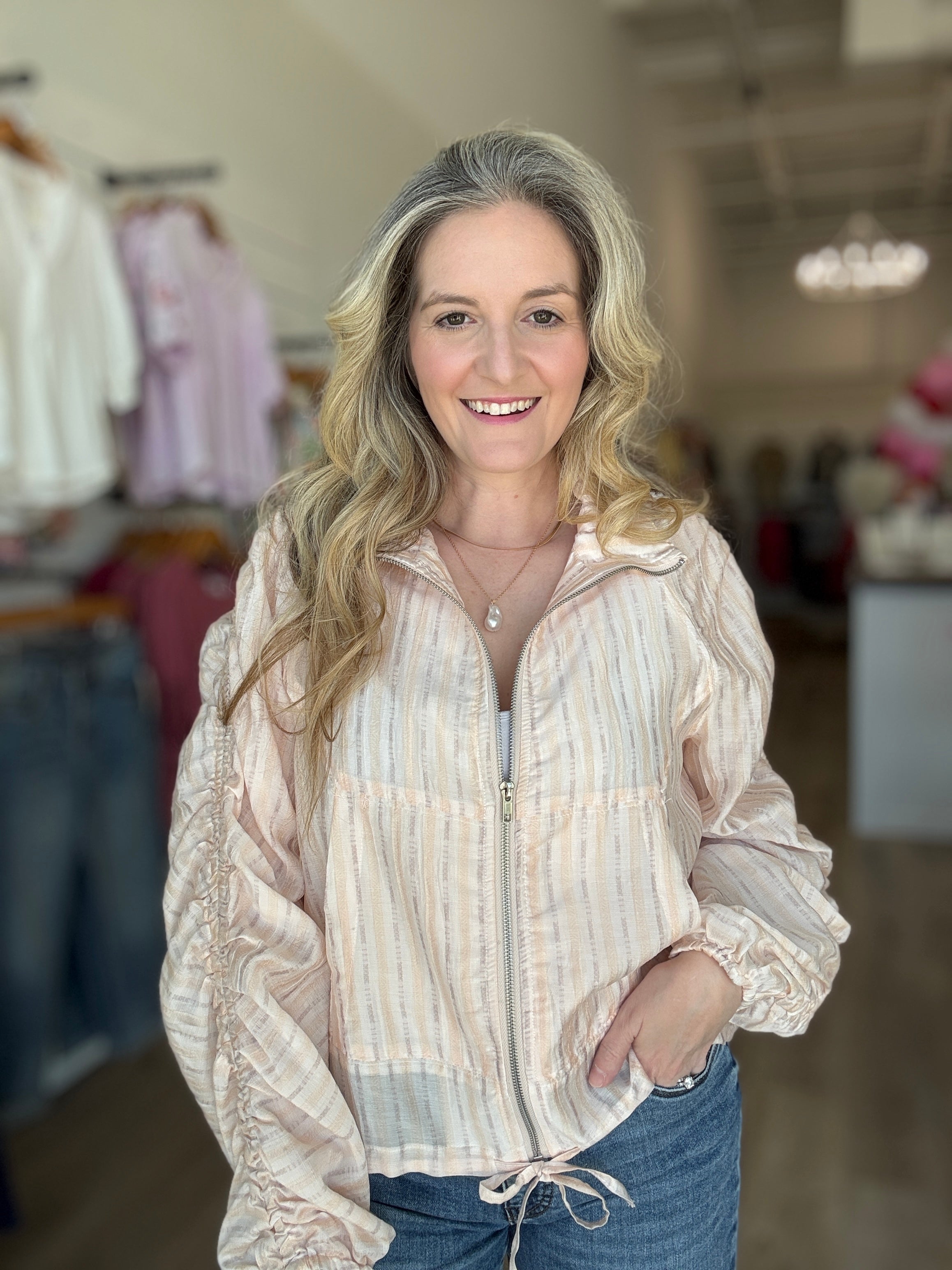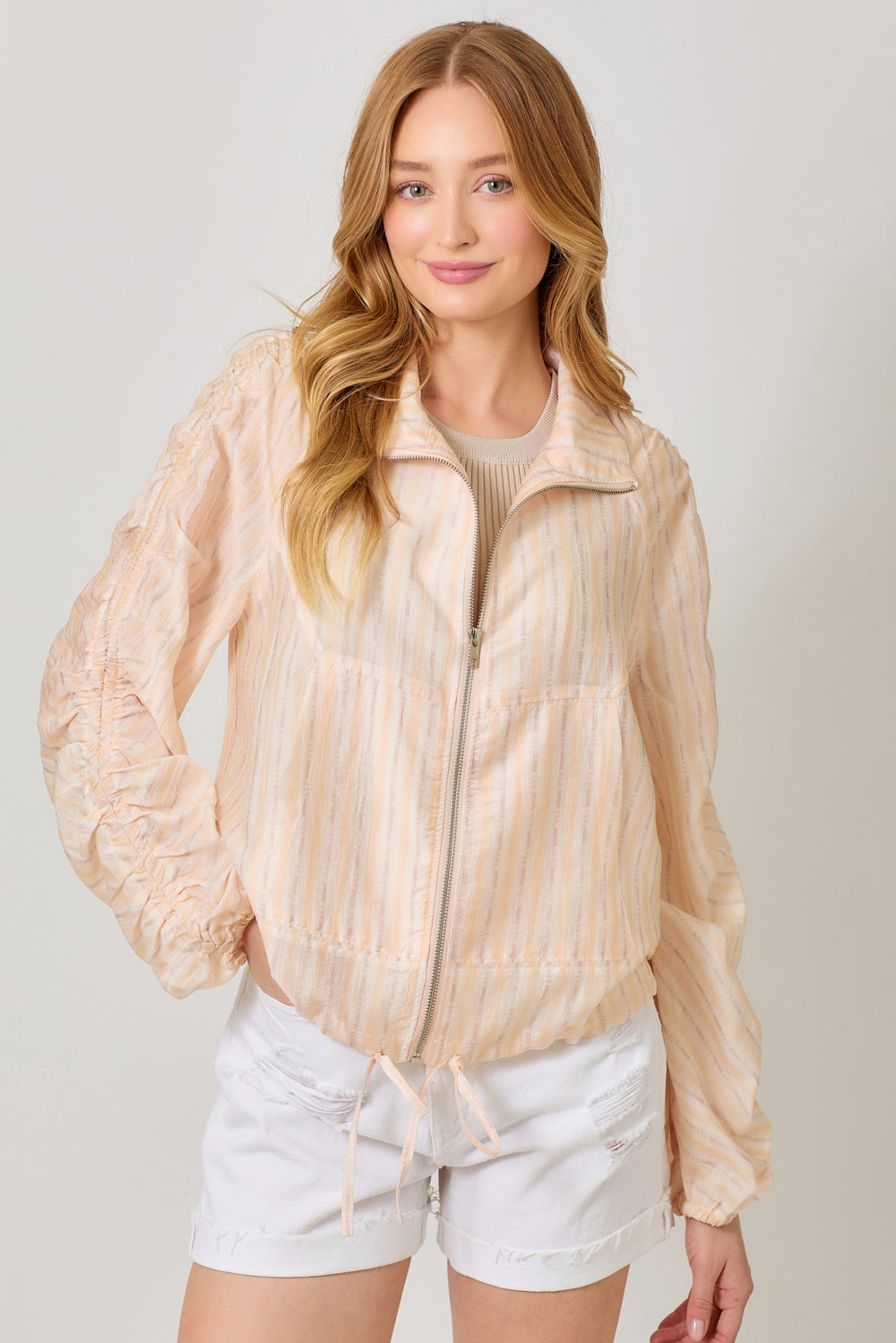 Add a pop of color to your wardrobe with our Ruched Sleeve Stripe Jacket! The peach blush hue is perfect for spring and the ruched sleeves add a touch of femininity. Perfect for layering over any outfit, you'll be sure to turn heads.