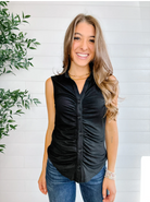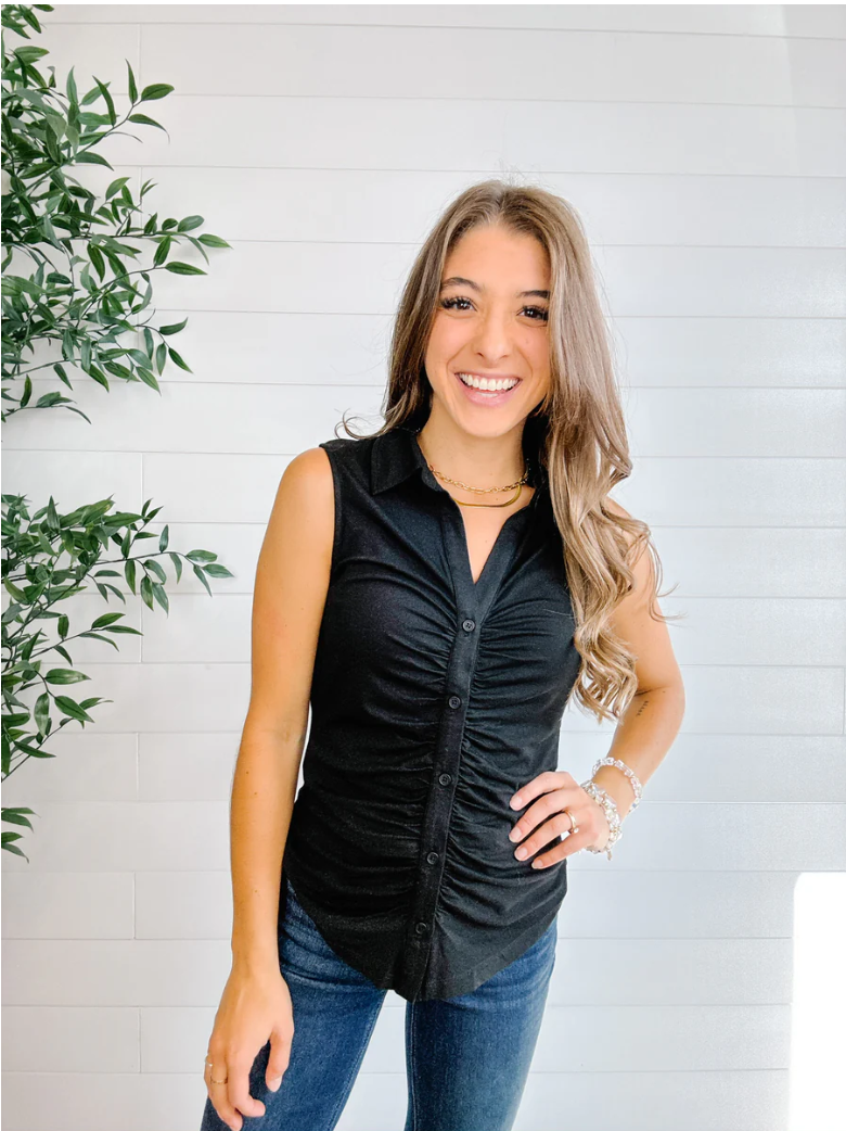Polished, flattering, and endlessly versatile — the Mac and Me Sleeveless Ruched Button Front Top is the elevated essential your wardrobe has been waiting for. Designed with strategic front ruching that contours and flatters, this sleeveless silhouette creates a smooth, confidence-boosting fit without feeling restrictive.