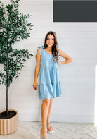 The adjustable tie shoulder straps add a playful, feminine touch while allowing for a customizable fit. A flattering tiered design creates flow and dimension, making this dress comfortable, breathable, and perfect for all-day wear.