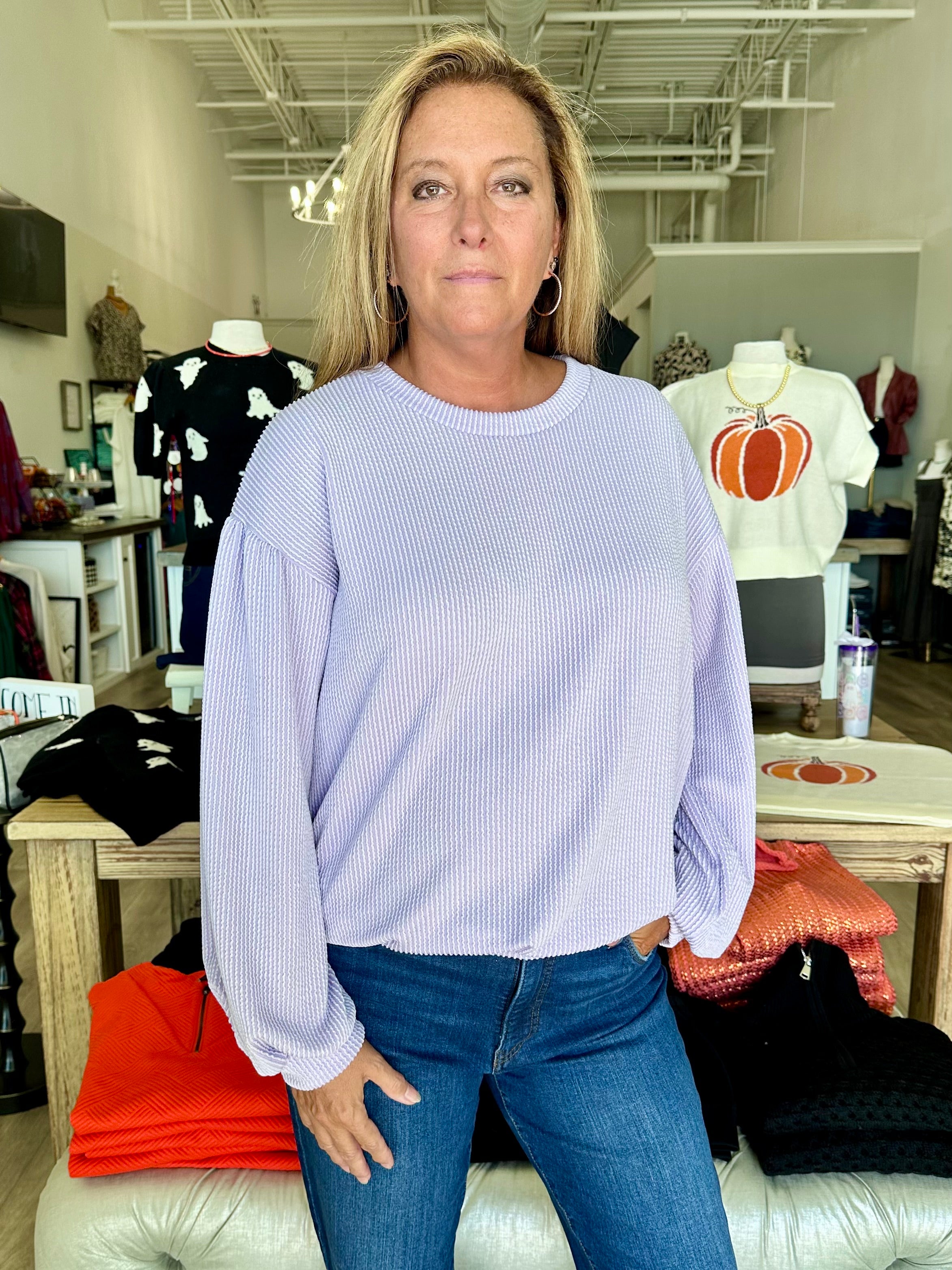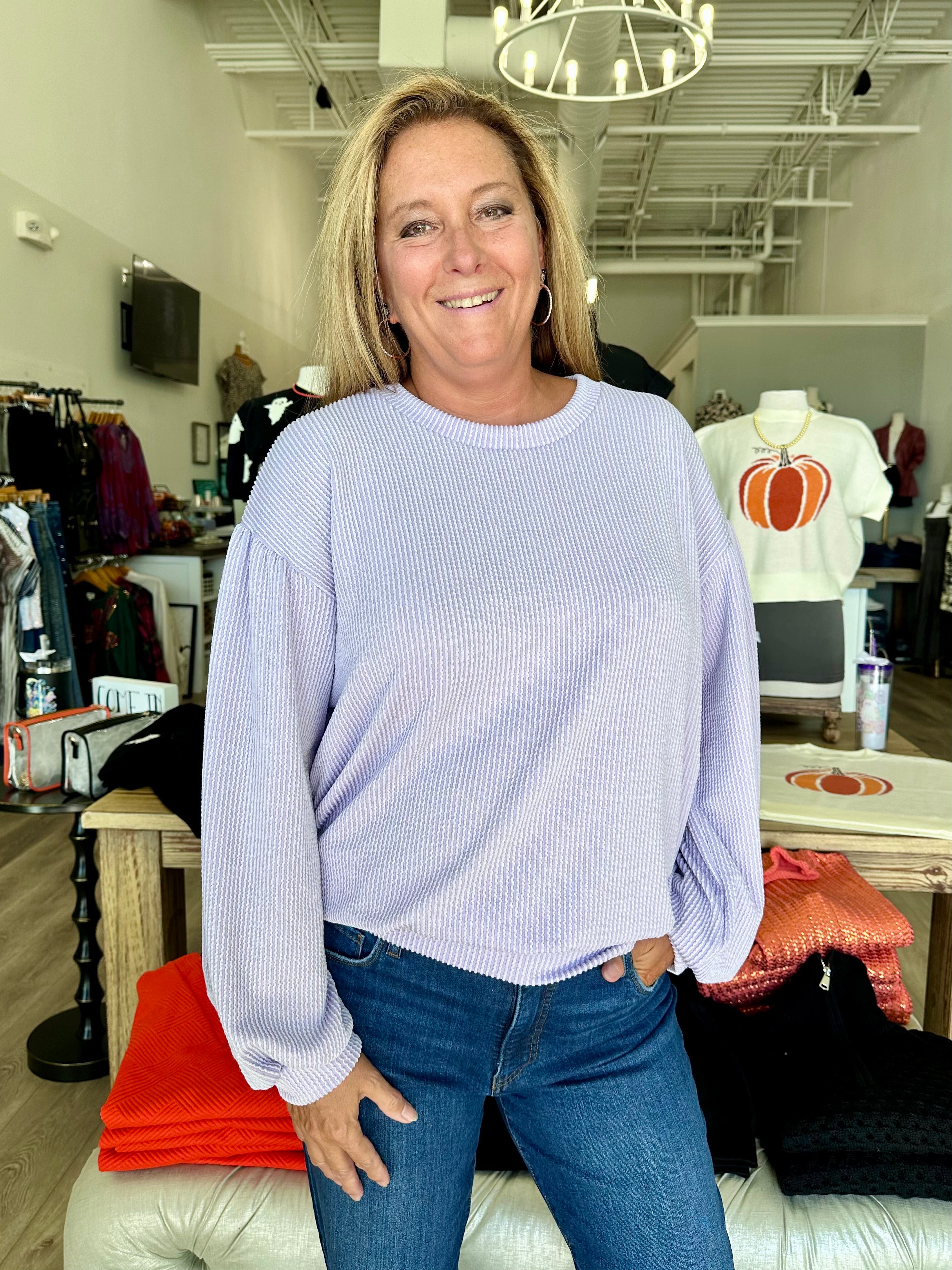 Elevate your wardrobe with the Cassandra Rib Top in soft lavender. This stylish piece features a flattering ribbed texture that enhances your silhouette while providing comfortable stretch for all-day wear. Its versatile design makes it perfect for layering or wearing on its own, effortlessly adding a touch of elegance to any outfit. Embrace both comfort and chic style with this must-have top.
