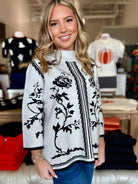 CONTRAST BORDER PATTERN JACQUARD KNIT MOCK NECK SWEATER