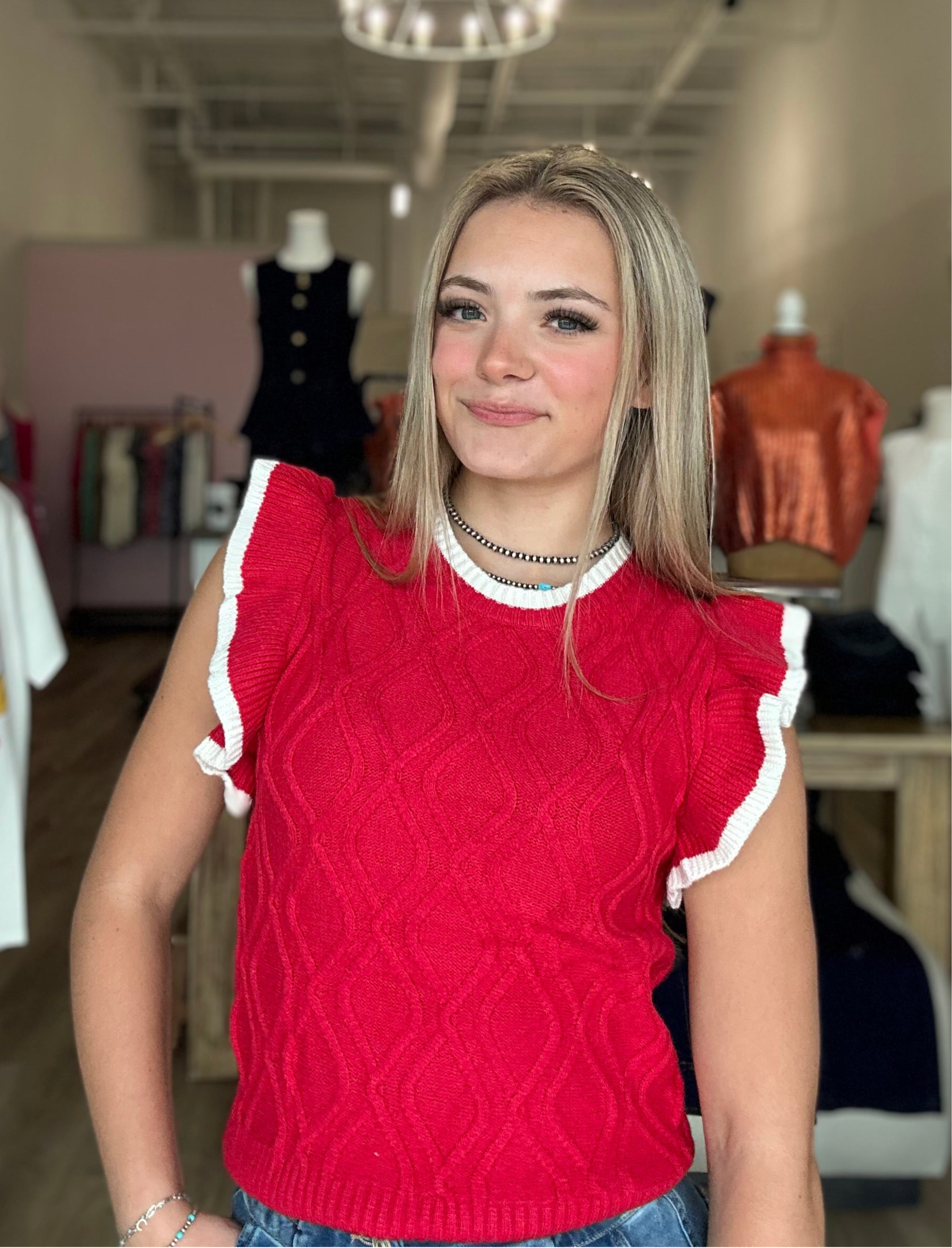 GAME DAY RUFFLE SLEEVE CABLE SWEATER TOP W/CONTRAST EDGE