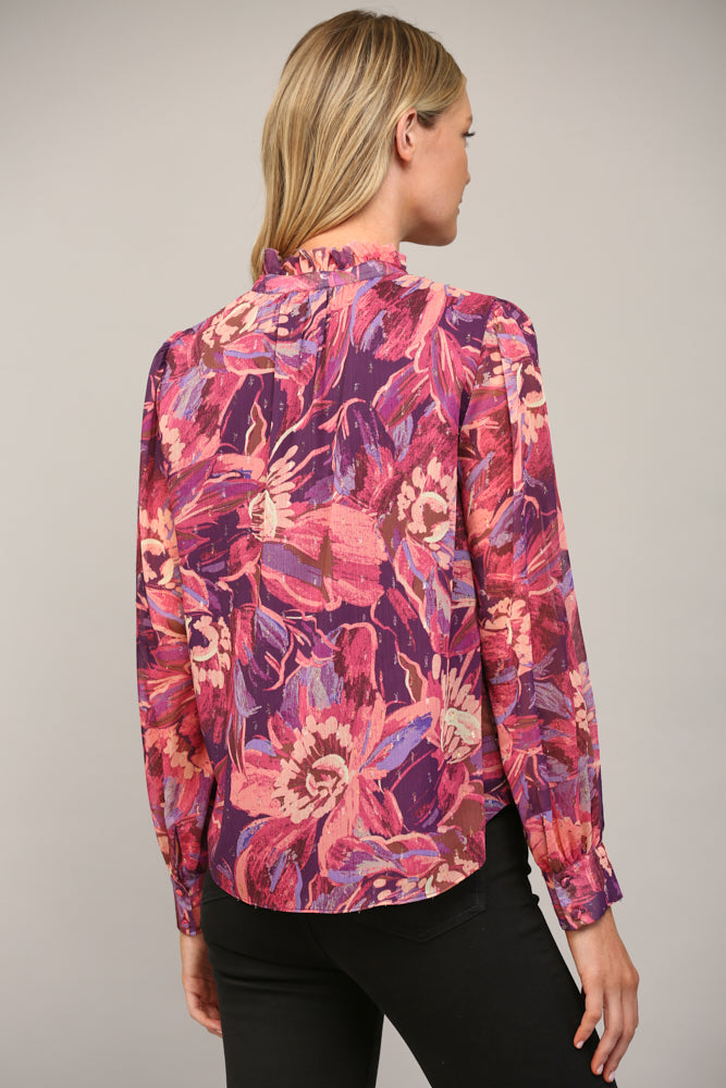 Indulge in luxury with our exquisite ABSTRACT PRINT WITH LUREX CHIFFON RUFFE NECK BLOUSE. The abstract print adds an artistic touch while the lurex chiffon material provides a subtle shimmer. The ruffle neck detail adds a touch of elegance to this exclusive blouse. Elevate your style with this statement piece.