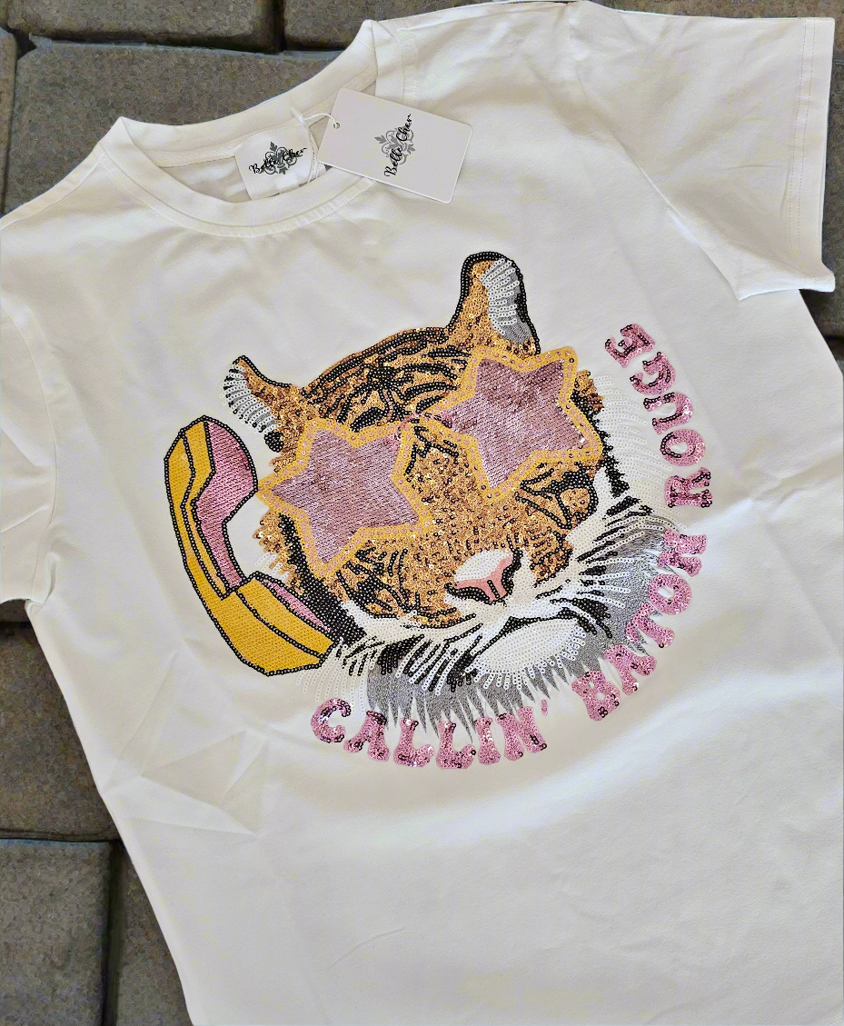 Show your love for the LSU Tigers with the CALLIN’ BATON ROUGE SHIRT! This white t-shirt features a sequined tiger wearing star sunglasses and holding a phone, representing the team's catchy saying. Stand out in the crowd and show your team spirit in style!