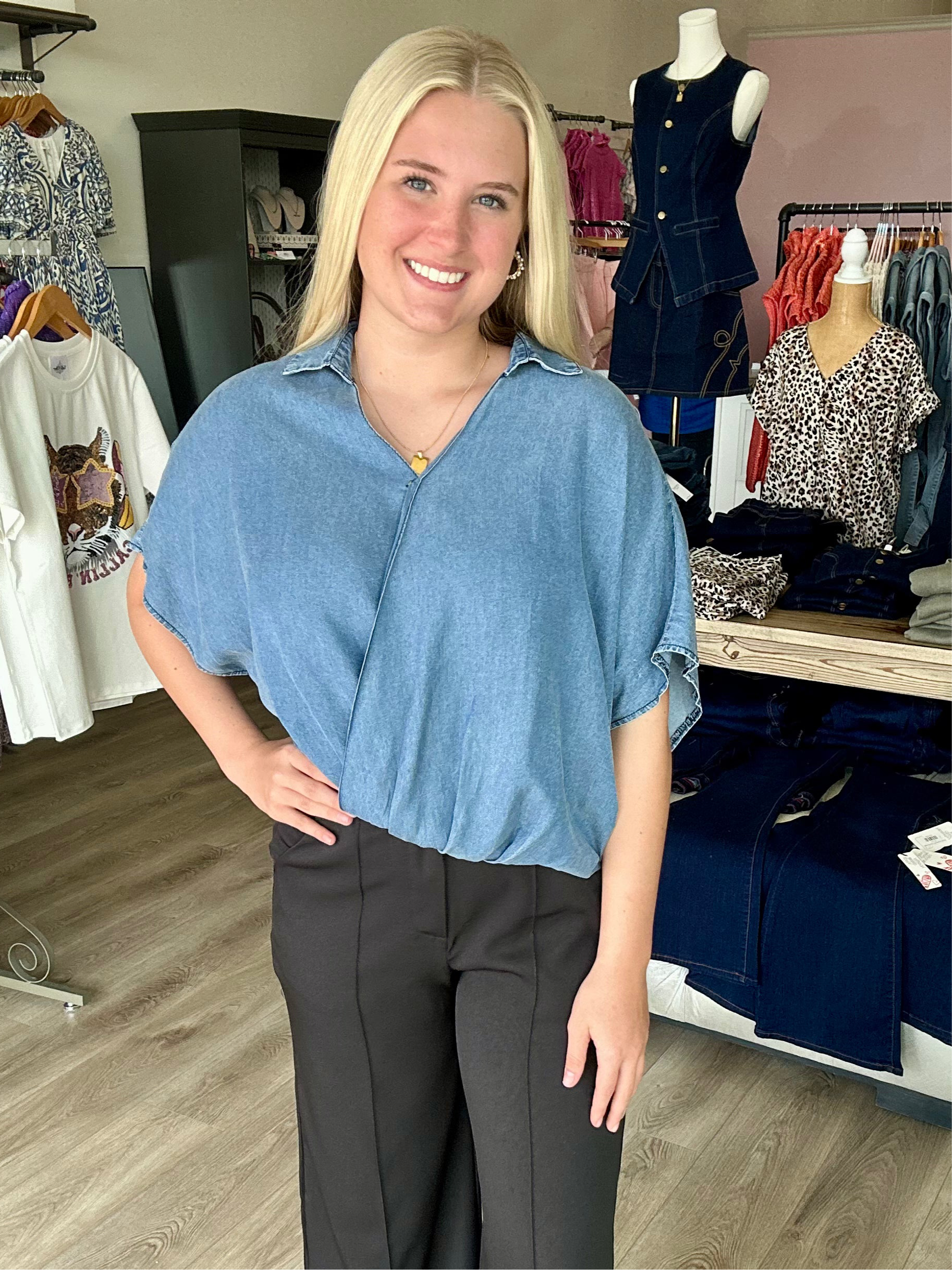 "Unleash your effortless style with our Drop Short Sleeve Woven Washed Chambray Collared Surplice! Made with a soft material and a stylish denim blue color, this top is perfect for any casual occasion. Get ready to turn heads and feel confident in this must-have addition to your wardrobe!"