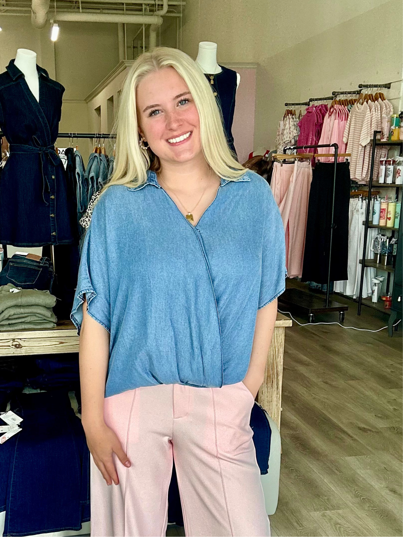 DROP SHORT SLEEVE WOVEN WASHED CHAMBRAY COLLARED SURPLICE