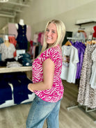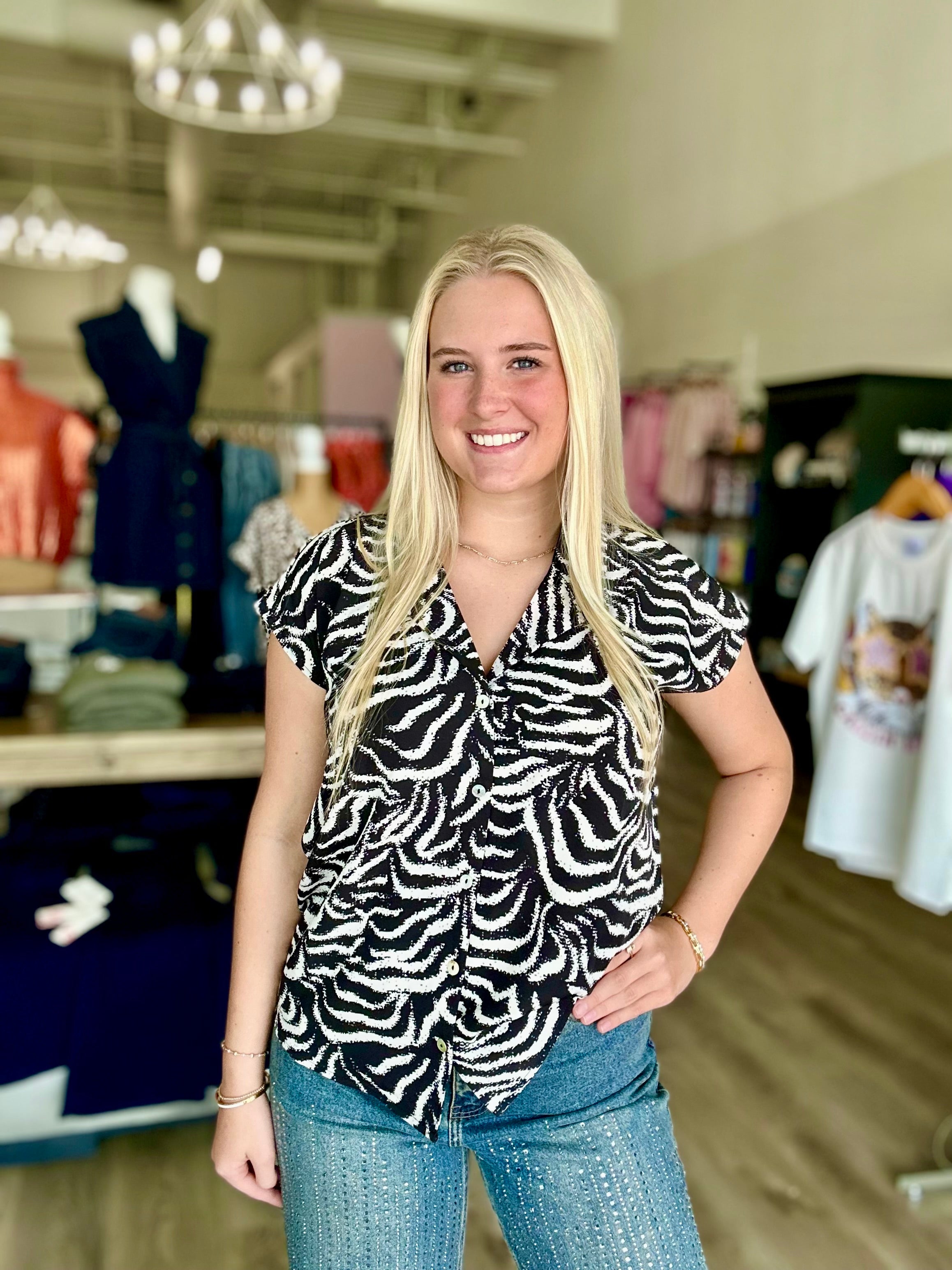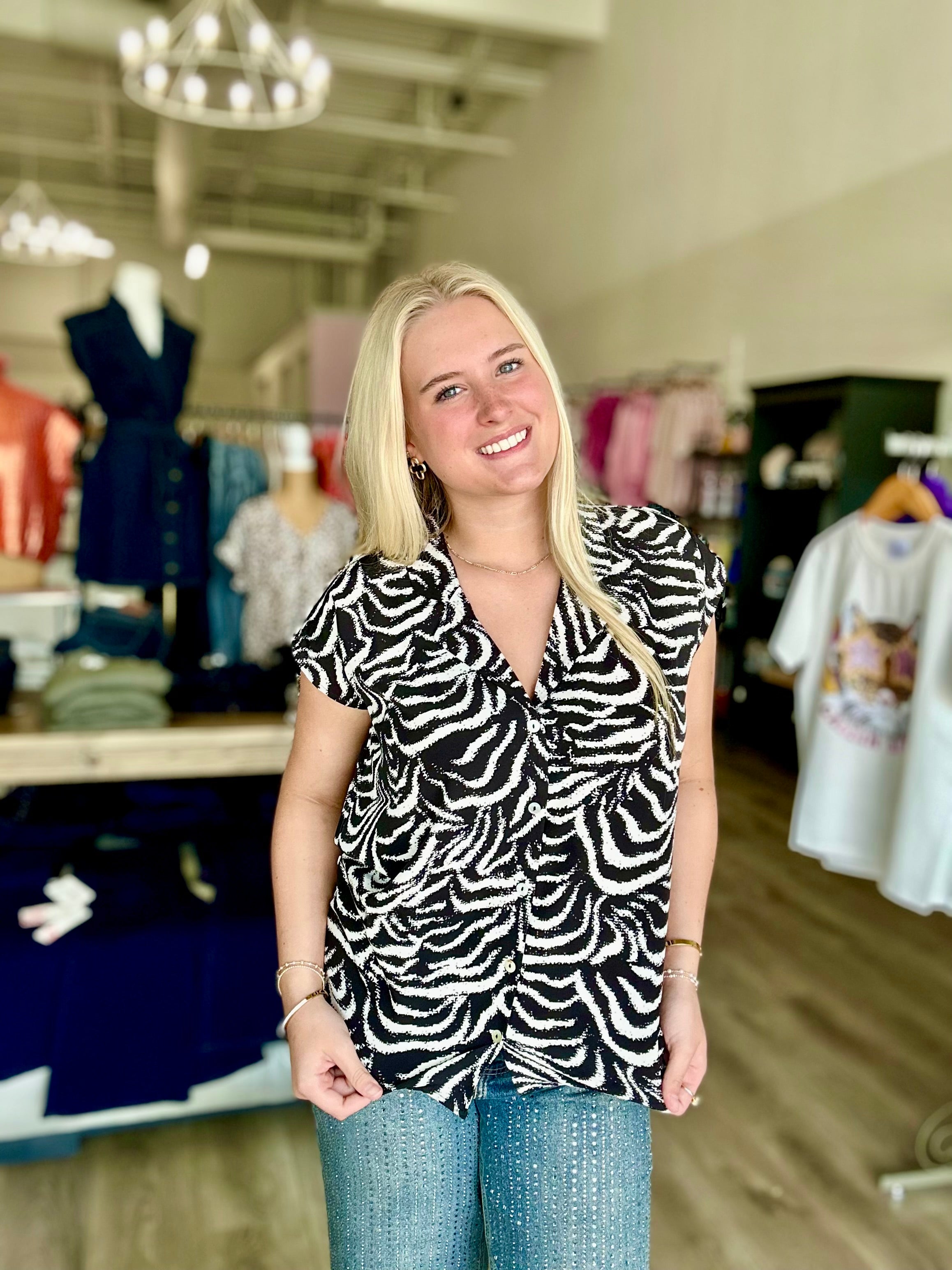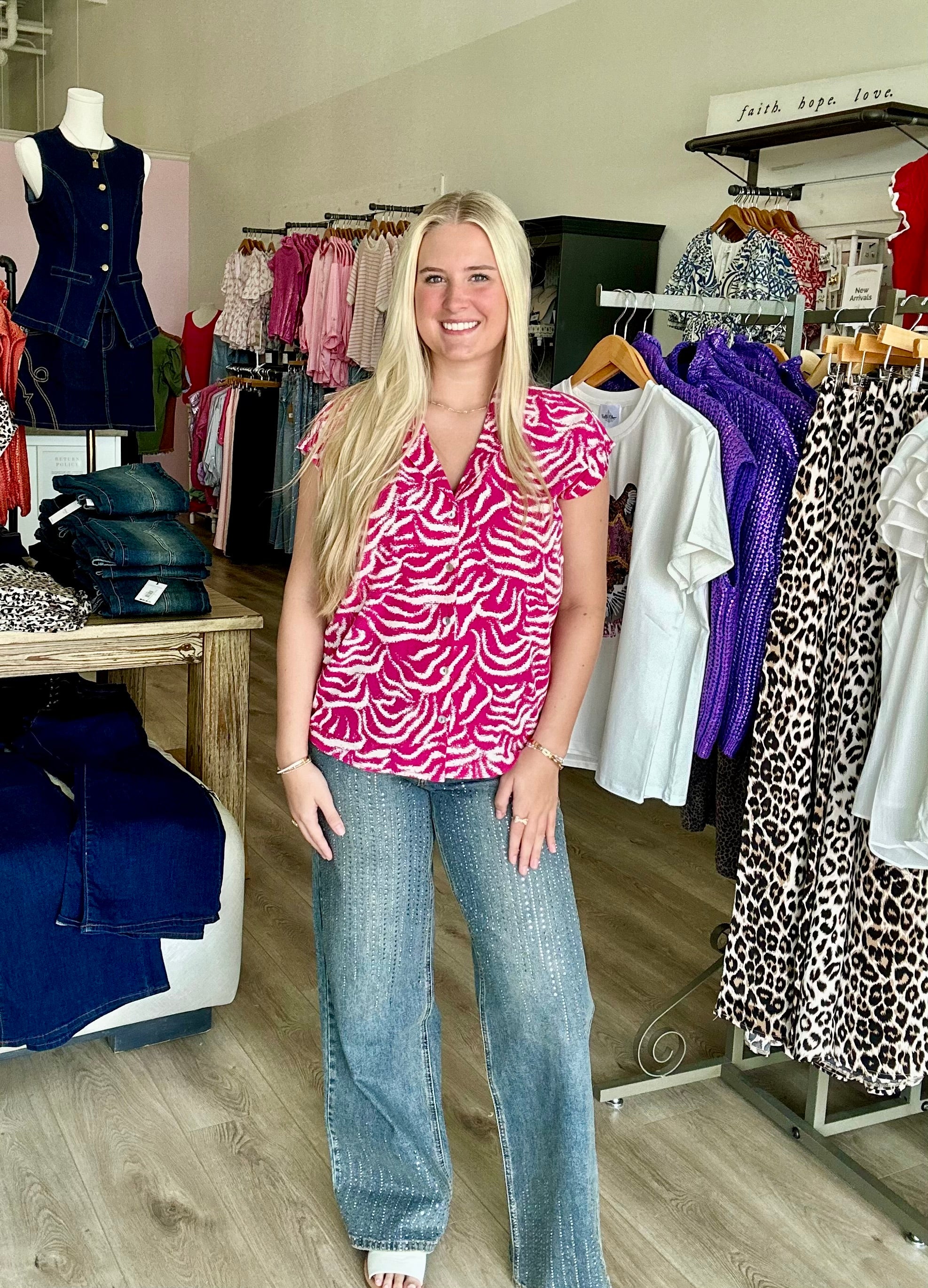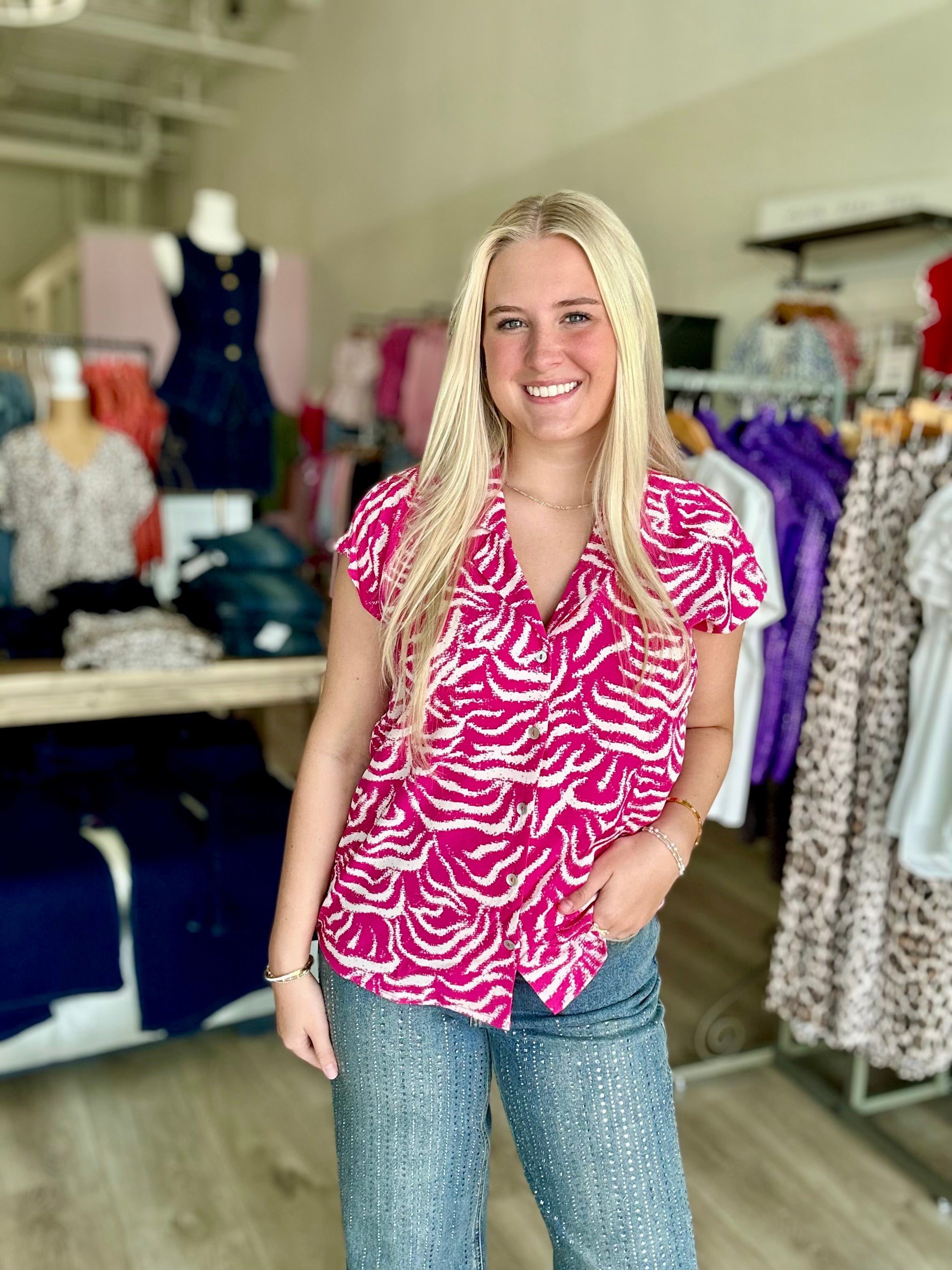Effortlessly stylish and comfortable, this DROP SHOULDER COLLARED V-NECK BUTTON DOWN adds a touch of sophistication to any outfit. The woven print and vibrant colors of black, fuchsia, and royal blue make it a versatile addition to your wardrobe, perfect for any occasion. Elevate your style game with this must-have piece!