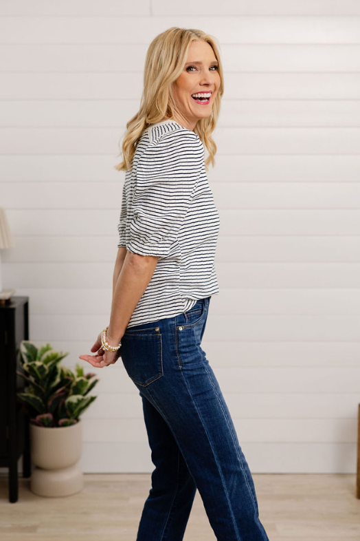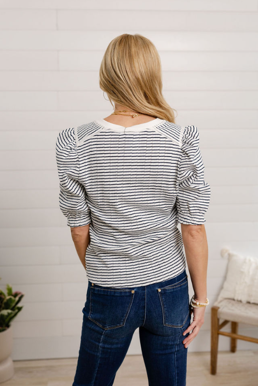 Crafted from 100% cotton knit fabric, this breathable cotton women’s top offers natural softness, lightweight comfort, and all-day wearability. The delicate elbow puff sleeves add subtle volume and feminine structure, while the textured stripe detail creates visual interest and dimension.