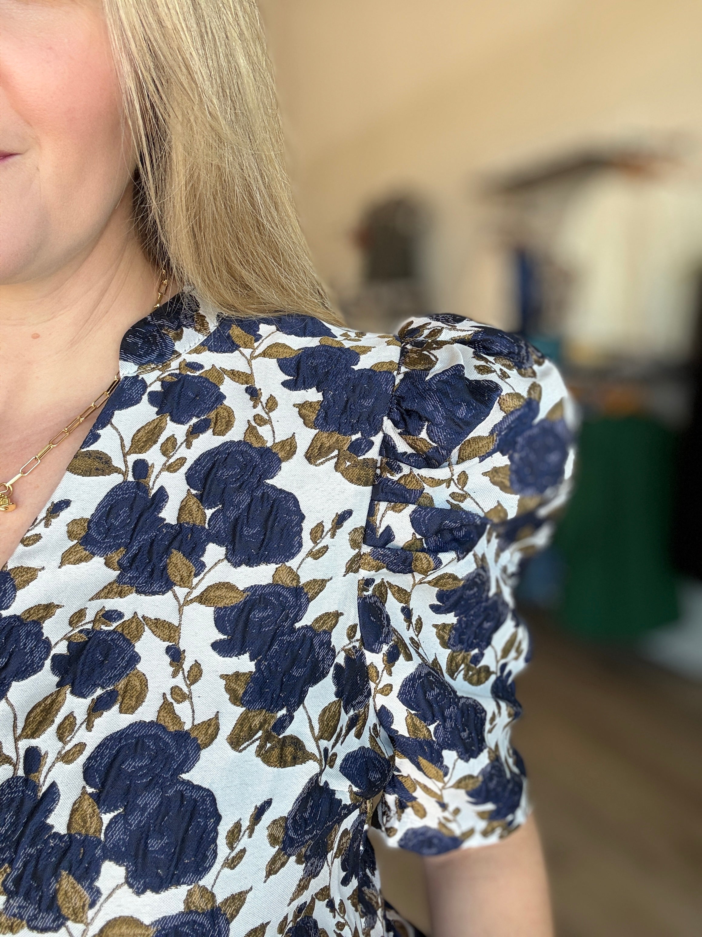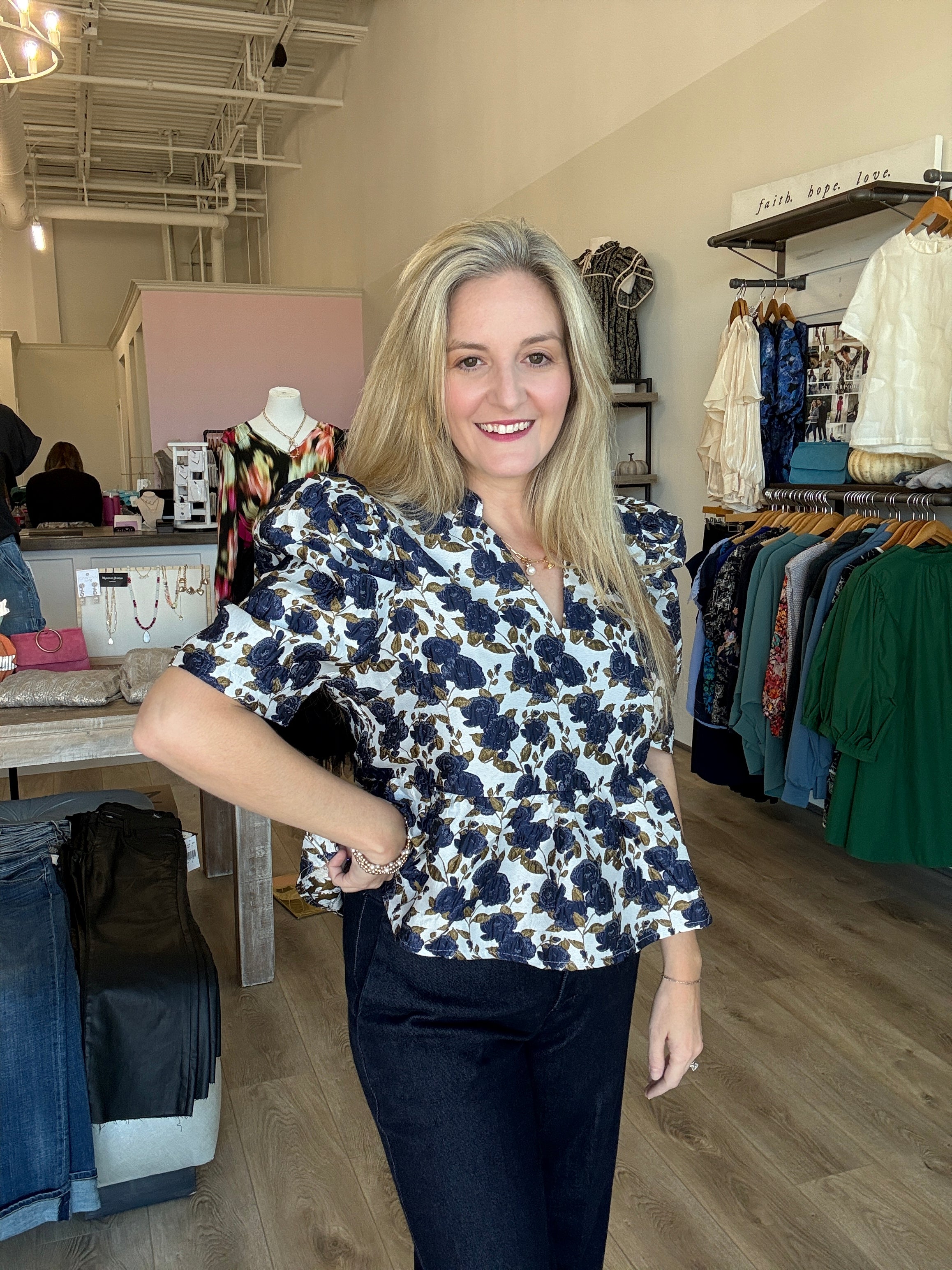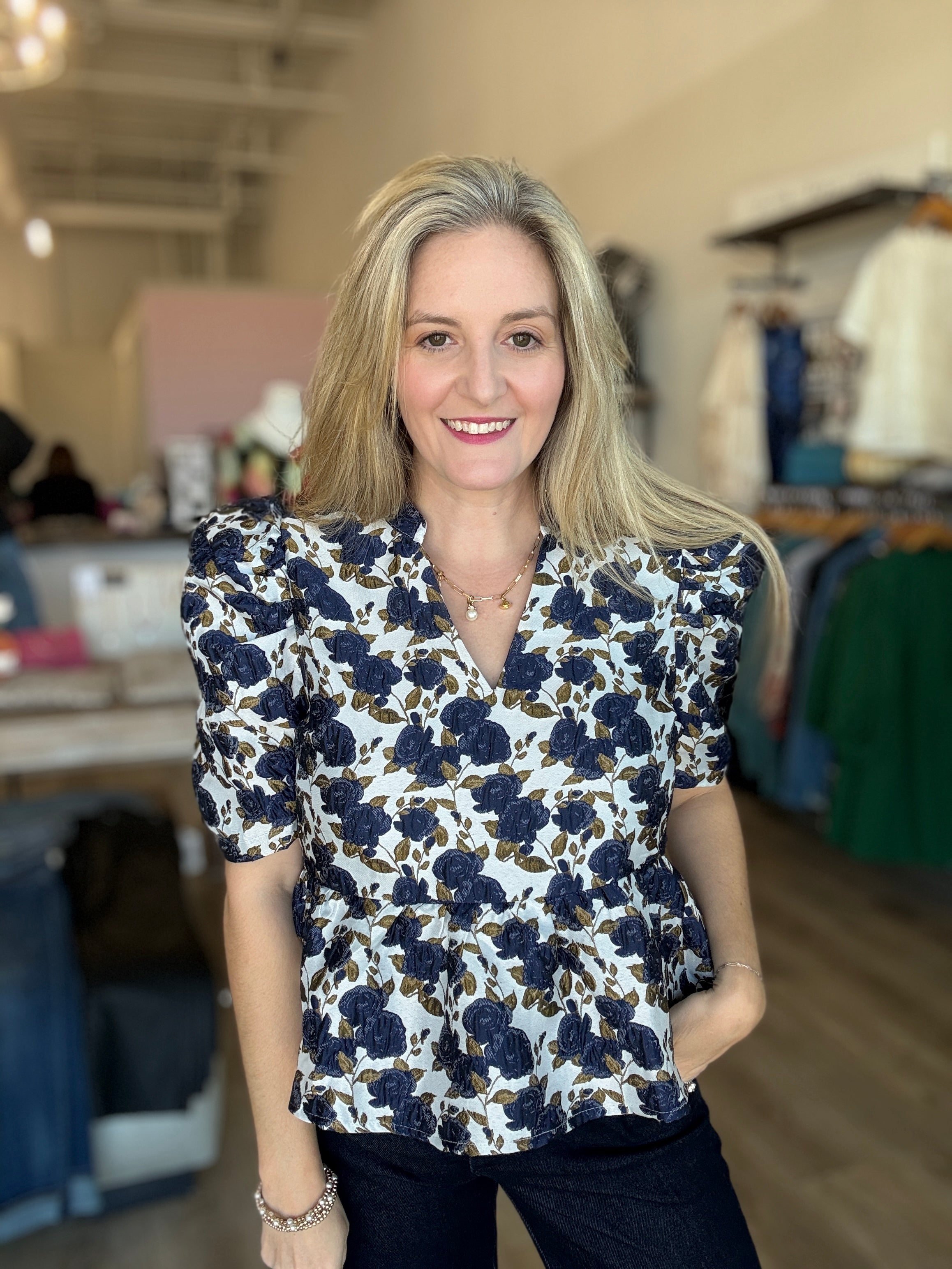 This feminine top features a stunning floral jacquard print and a flirty peplum silhouette. The v neck and puff sleeves add a touch of romance while the lightweight, non-sheer fabric makes it perfect for any occasion. Elevate your wardrobe with this charming piece!