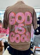 Stay stylish and share your faith with our GOD IS GOOD ALL THE TIME HEAVYWEIGHT WASHED COTTON CREW NECK. The front features a script font that reads "ALL THE TIME" while the bold pink bubble font on the back reads "GOD IS GOOD". The acid wash look adds a trendy touch. Available in coffee and black. Show the world the power of positivity!