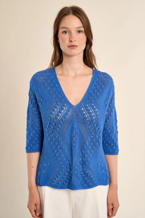The intricate open crochet knit design creates beautiful texture and dimension, while the flattering V-neckline sweater top adds a soft, feminine touch. Finished with easy mid-length sleeves and a relaxed straight fit silhouette, this piece drapes naturally for that effortless, lived-in feel.