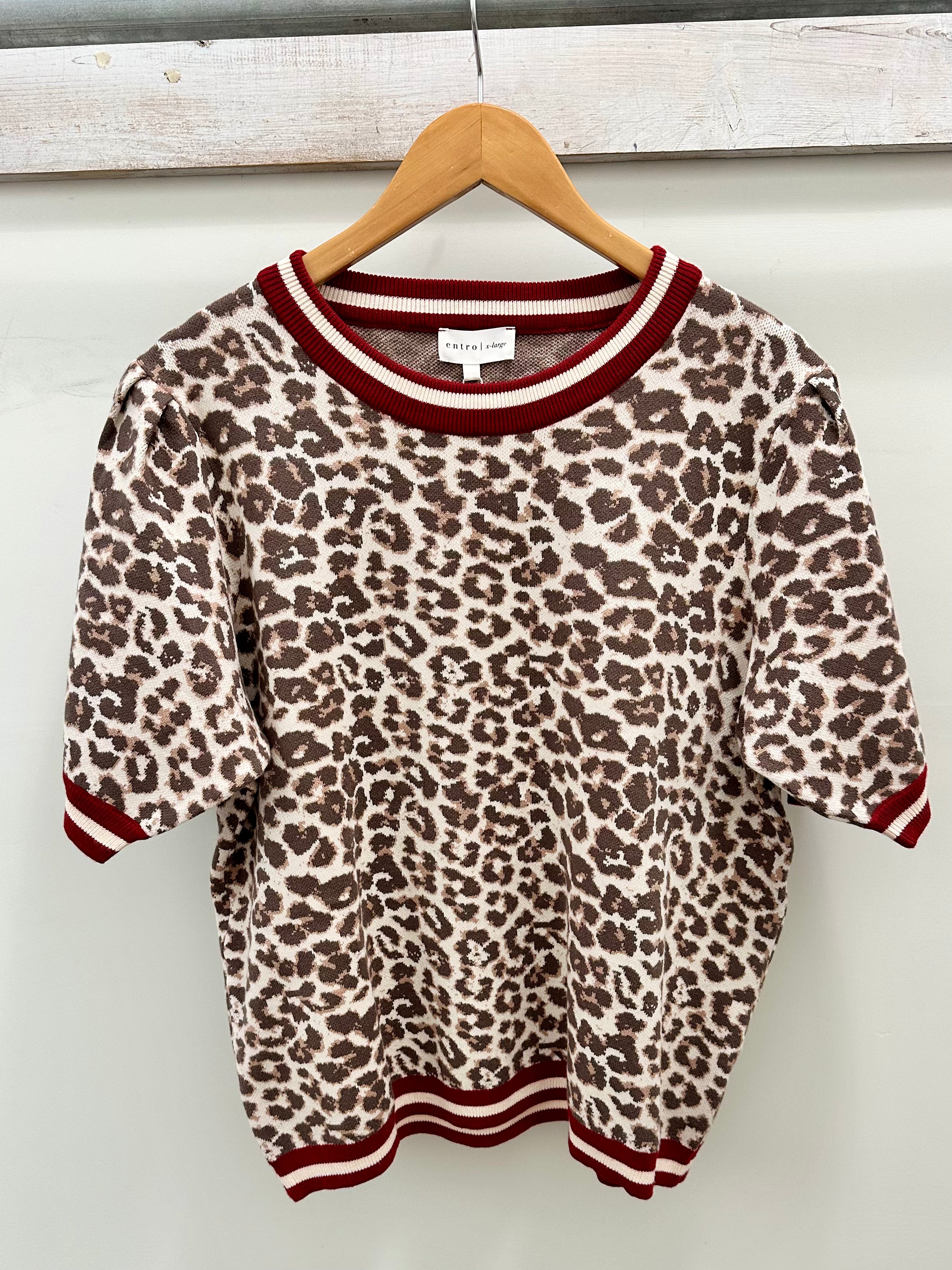 This lightweight, knit top features a bold leopard pattern with short puff sleeves accented by a vibrant multicolor band. Unlined and non-sheer, it offers comfortable wear without compromising style, making it a perfect choice for adding a trendy touch to any outfit.