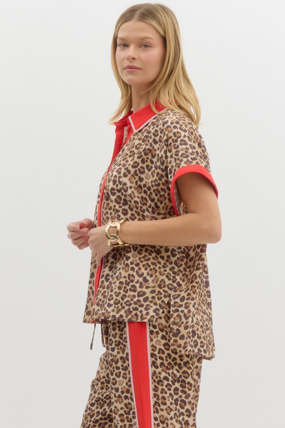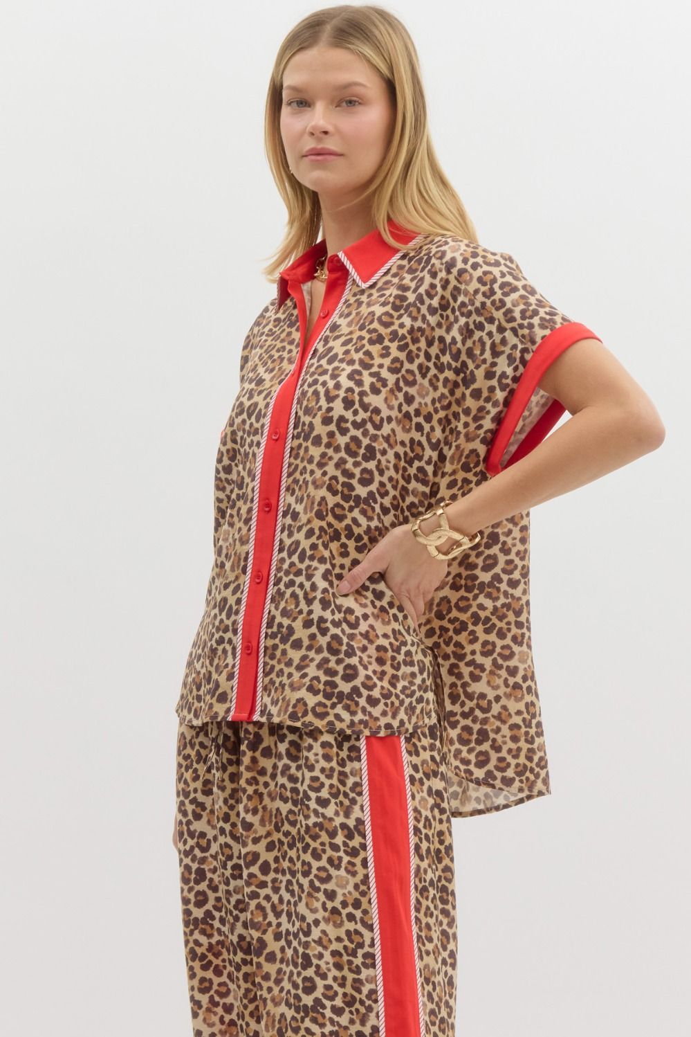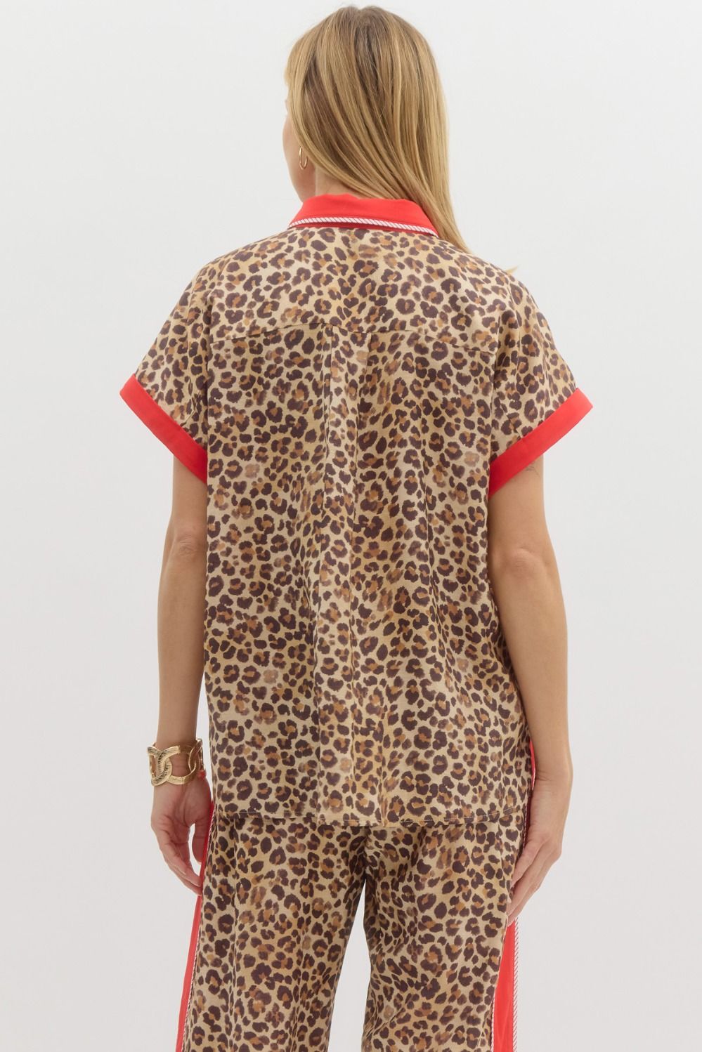 Embrace your wild side with our Leopard Print Short Sleeve Top! Featuring a contrasting classic collar and button front closure, this top adds a touch of elegance to the fierce leopard print. The lightweight, non-sheer fabric offers comfort and style for any occasion. Unleash your inner fashionista with this must-have top.