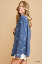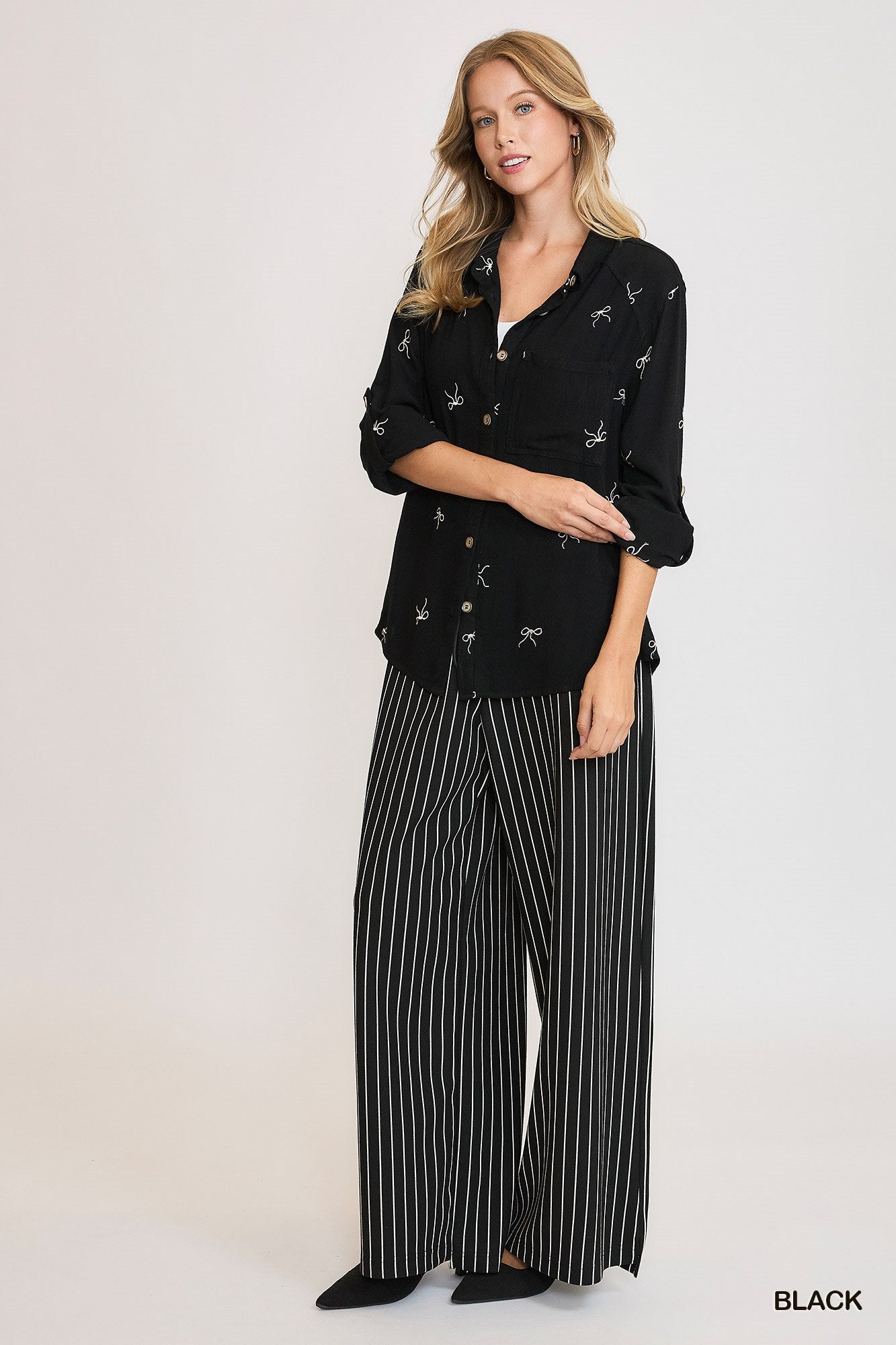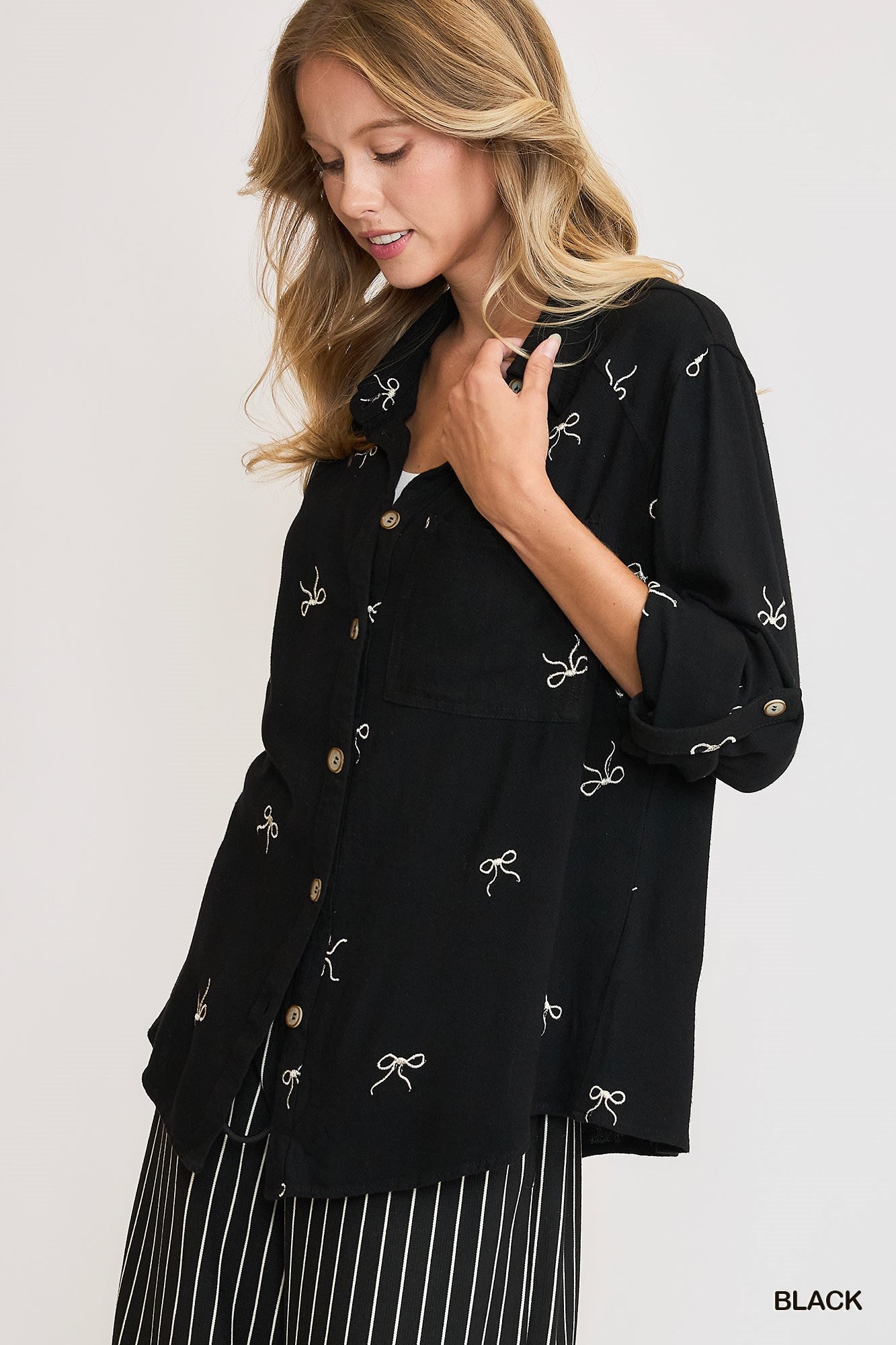What truly sets it apart is the delicate embroidered bow pattern woven subtly throughout the fabric — a fashion-forward detail that adds charm and texture without overwhelming the look. The fitted silhouette creates a clean, flattering shape that’s easy to style tucked in or worn loose. Available in Black, Denim, and Oatmeal, each color offers a versatile neutral base with just the right amount of personality.