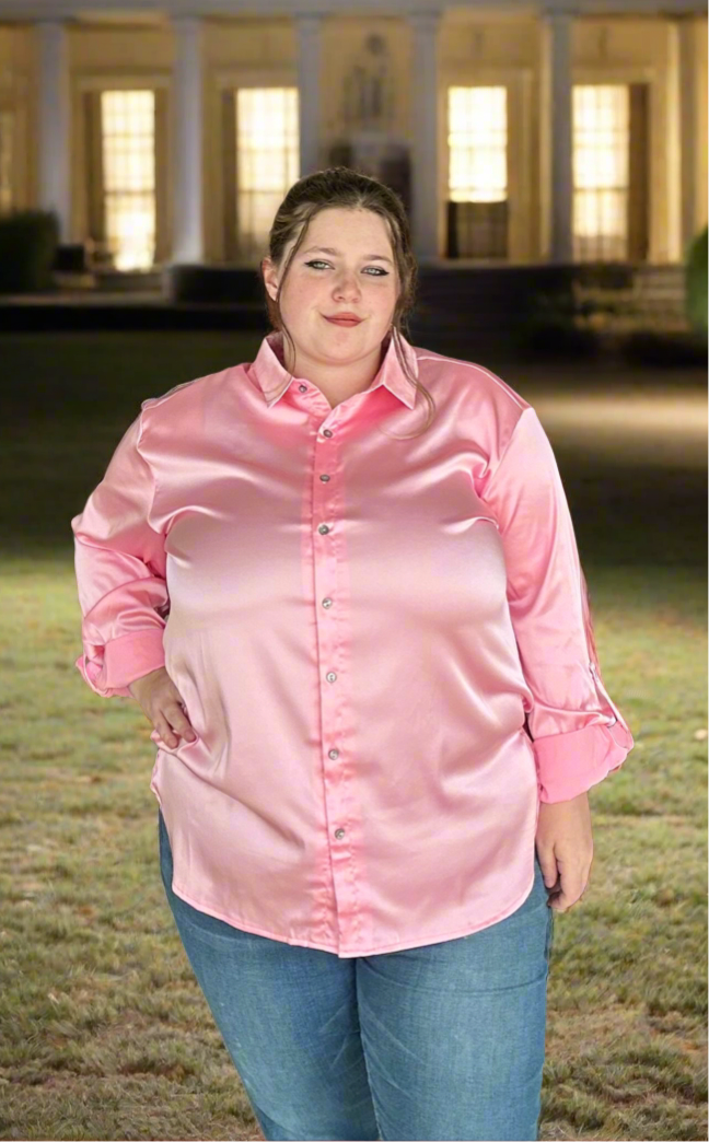 LONG SLEEVE WOVEN SATIN SHIRT W/ROLLUP SLEEVE