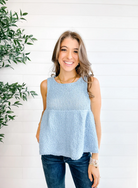 Effortlessly feminine and easy to wear, the Mac and Me Swing Sweater Tank Top is the perfect blend of texture, comfort, and flattering movement. Designed in a soft light blue knit, this sleeveless sweater top features a relaxed, flowy silhouette that drapes beautifully for an easy, elevated look.