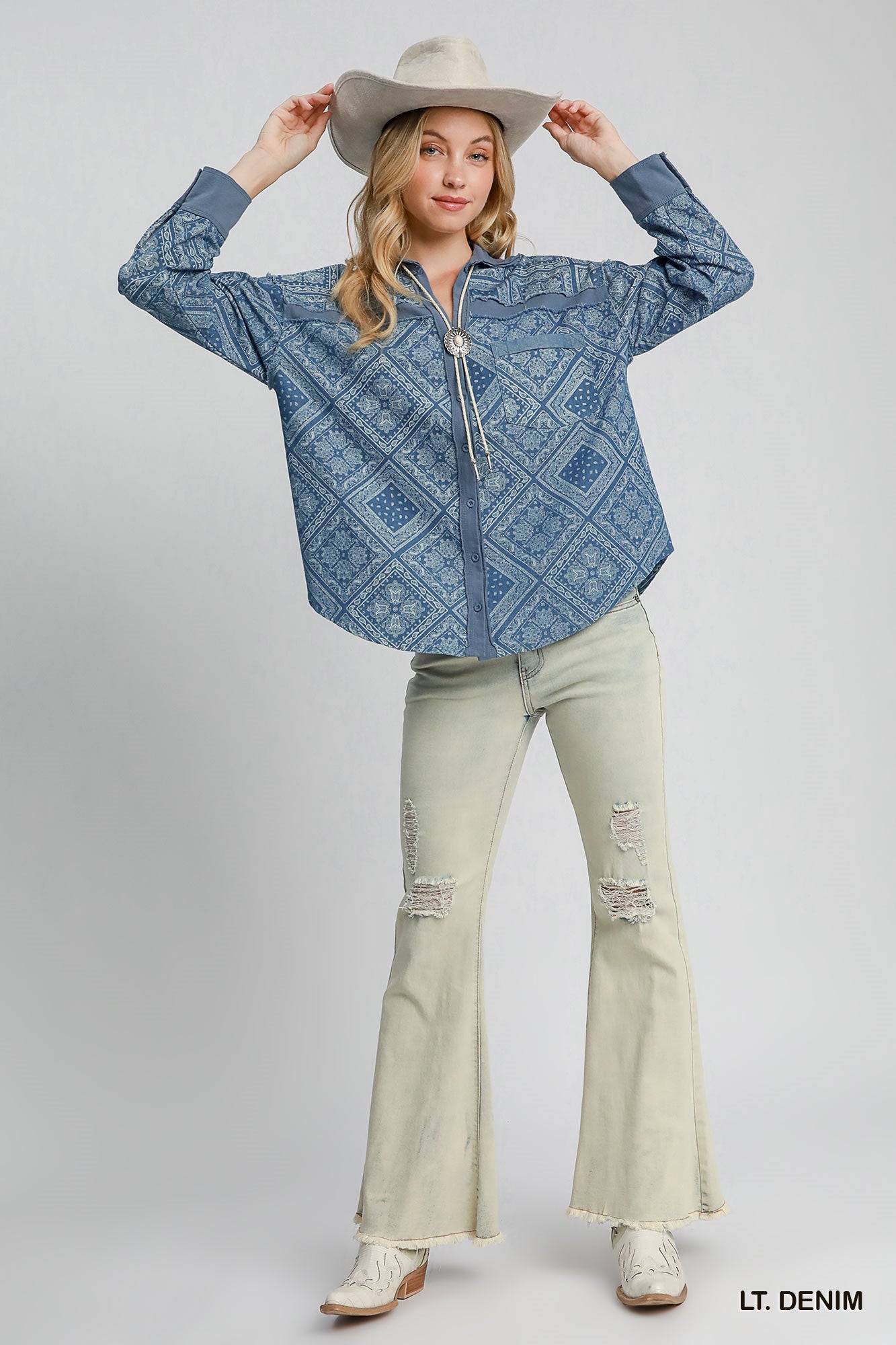 The all-over paisley print adds unexpected flair, while frayed detailing brings just the right amount of edge. Designed to wear open as a jacket or buttoned up as a shirt, this piece is endlessly versatile and effortlessly cool. Whether you’re layering it over a simple tee or styling it as the star of your outfit, this denim shirt jacket is made for standing out while staying true to your style.