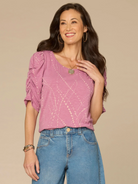 Polished yet playful, this boutique knit blouse delivers feminine detail with everyday wearability.