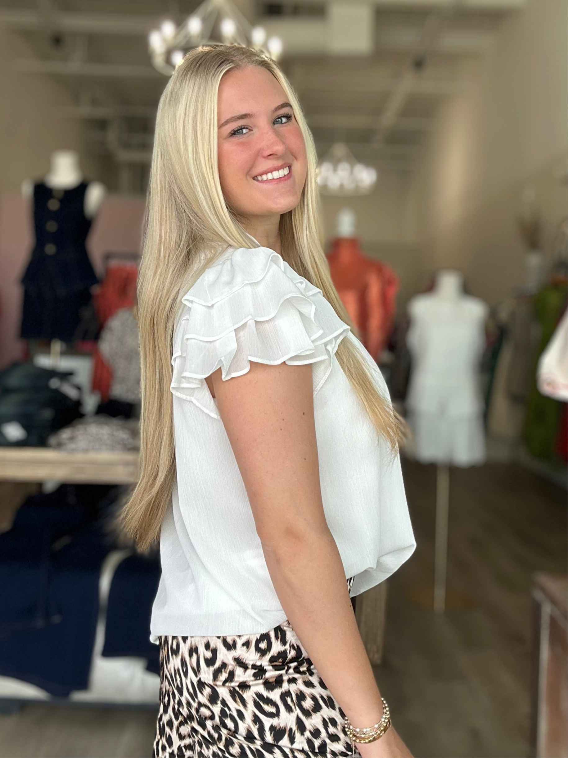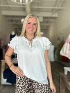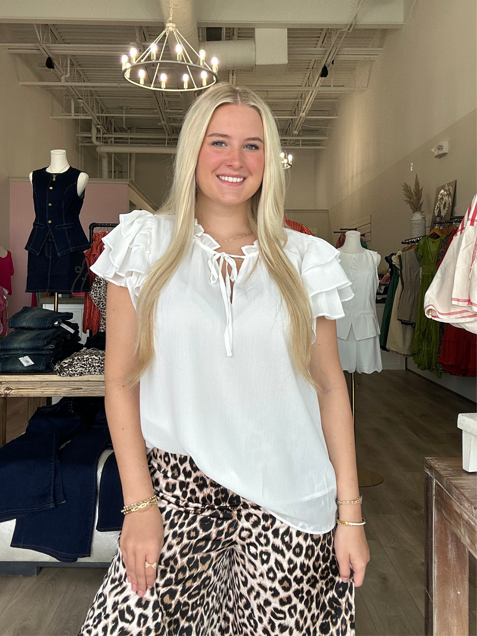 Elevate your wardrobe with our Ruffle Sleeve Blouse Top! The delicate ruffle sleeves add a touch of elegance to any outfit, while the comfy and cute design ensures you stay comfortable and stylish all day long. Perfect for dressing up or down, this top is a must-have for any fashion-forward individual.