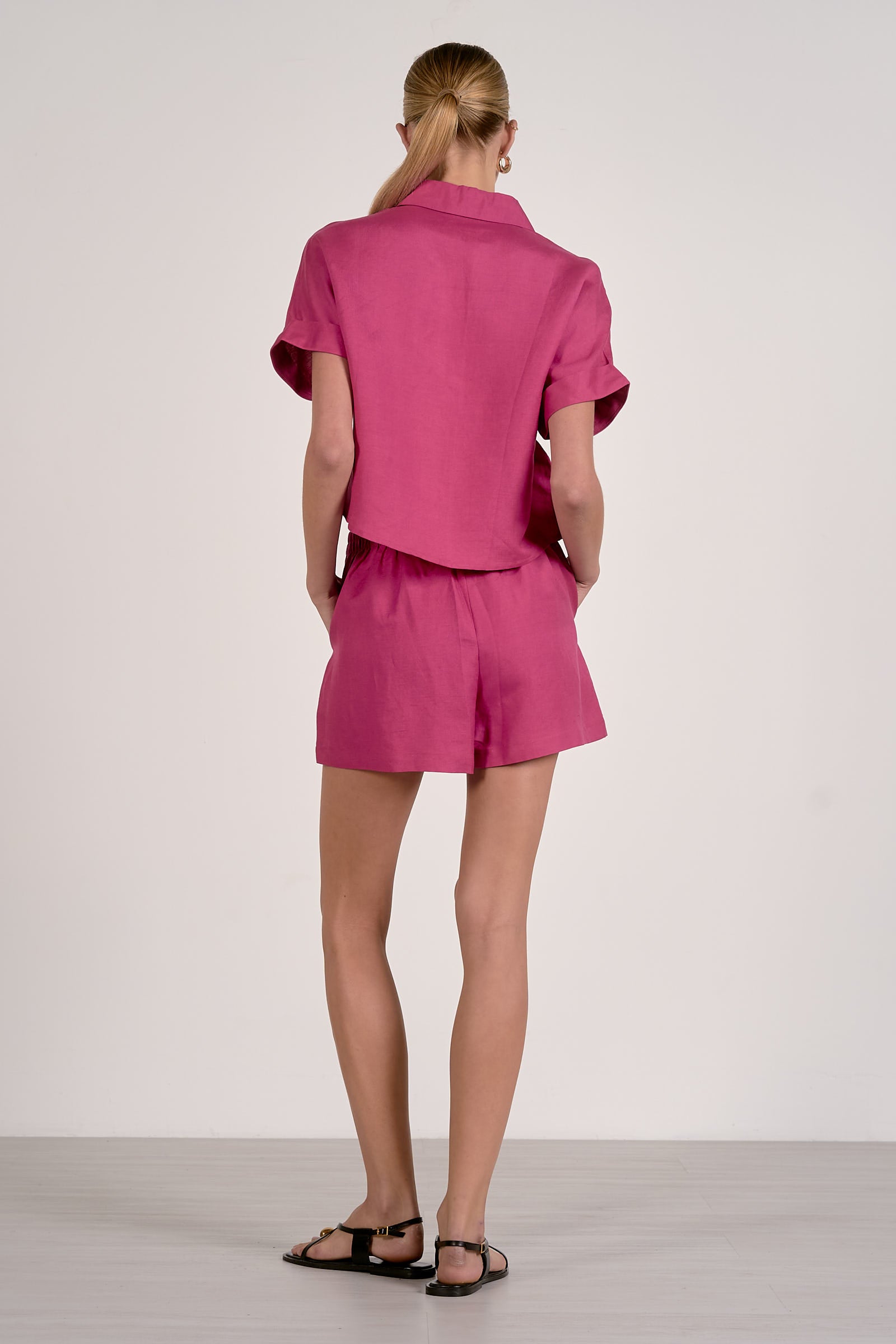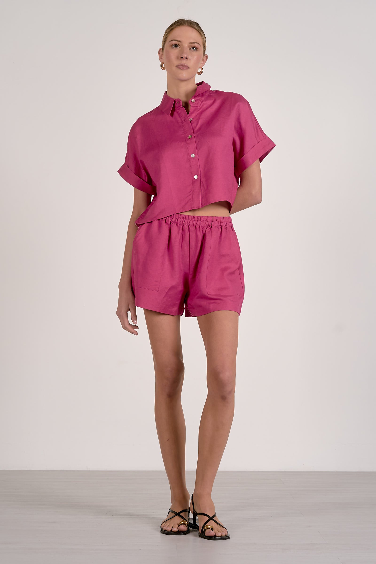 Effortlessly polished with a relaxed, modern feel, this cropped button down top is a versatile staple designed for everyday style. Featuring a classic collared neckline and a full button front, this piece blends timeless tailoring with a contemporary silhouette. The cuffed short drop sleeves add a relaxed touch, while the cropped length creates a flattering, modern shape that pairs perfectly with high-waisted bottoms.