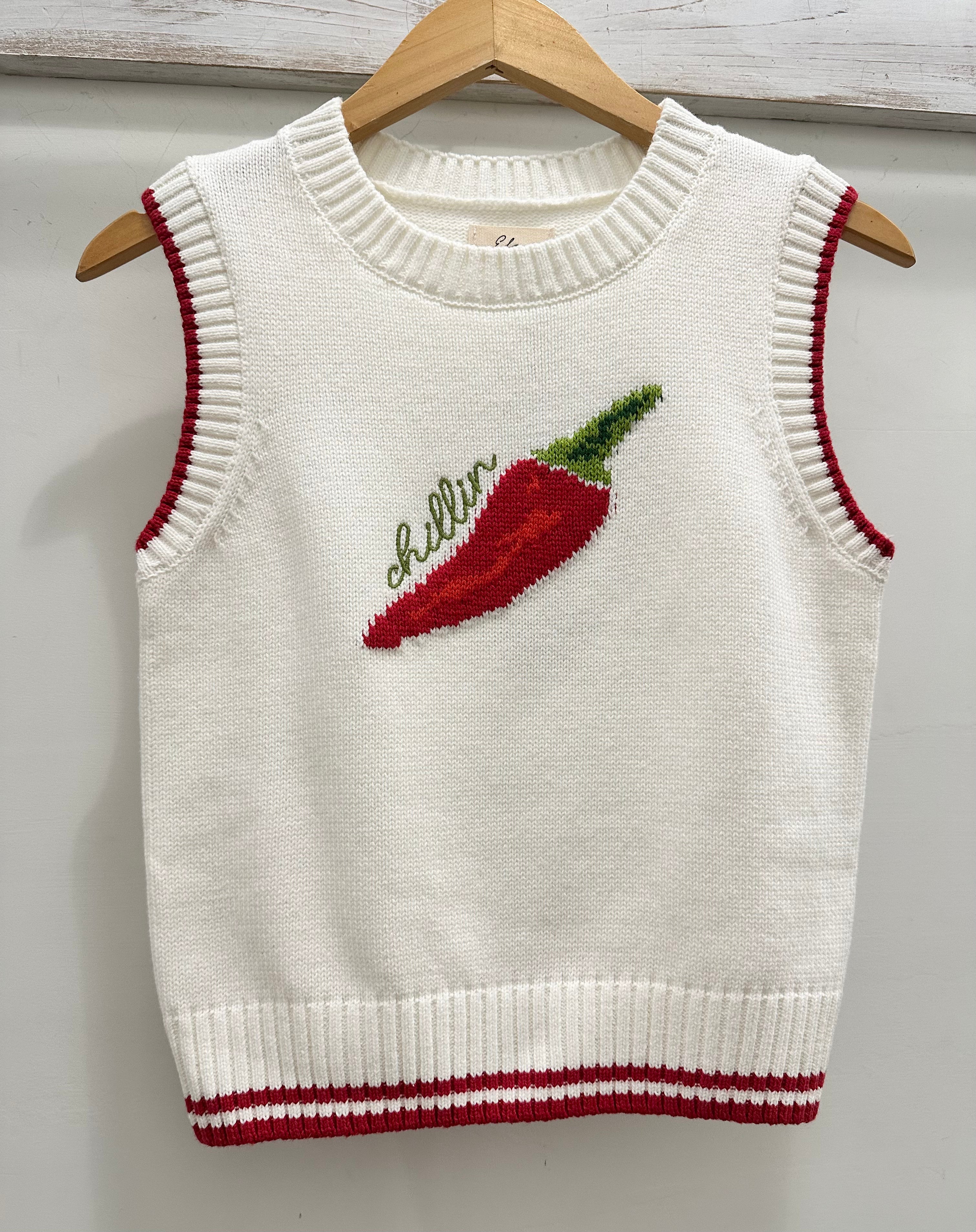 Playful with a polished twist, the Chili Pepper Sleeveless Knit Sweater Vest delivers personality without sacrificing sophistication. Crafted in a soft off-white knit, this structured sweater vest features a bold embroidered chili pepper graphic across the front — adding just the right amount of cheeky charm while still feeling elevated and wearable.