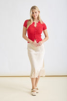 Wear it snapped up as a chic standalone top or open over a tank or tee for a relaxed, layered look. The classic red hue adds a bold pop to your wardrobe while still feeling timeless, and the snap button closure makes styling quick and fuss-free.