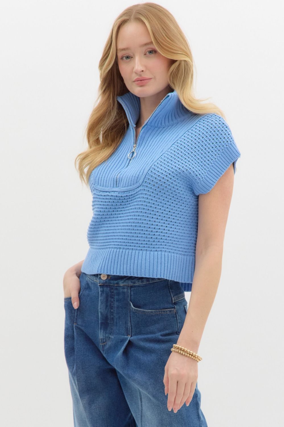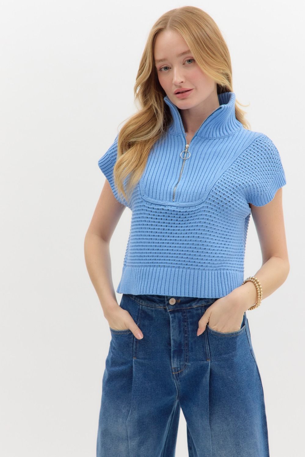 This solid muscle sweater knit pullover top is a lightweight, semi-sheer piece that will keep you warm and stylish. Featuring a high neck band and front half zipper closure, this knit top is both comfortable and trendy. Don't miss out on this unlined, must-have addition to your wardrobe!