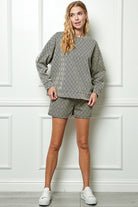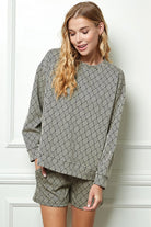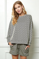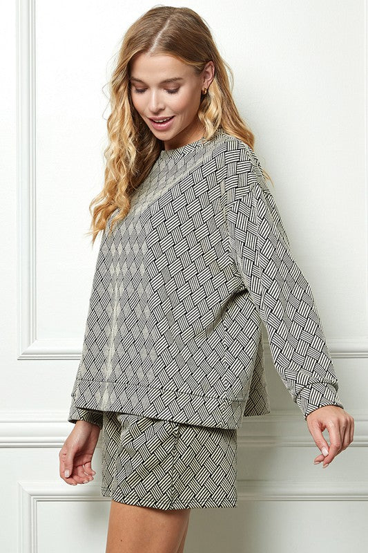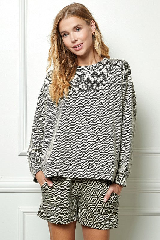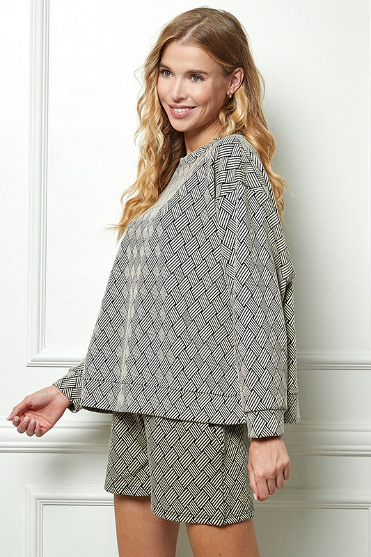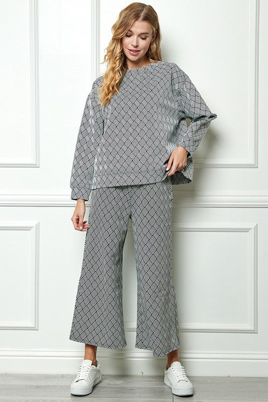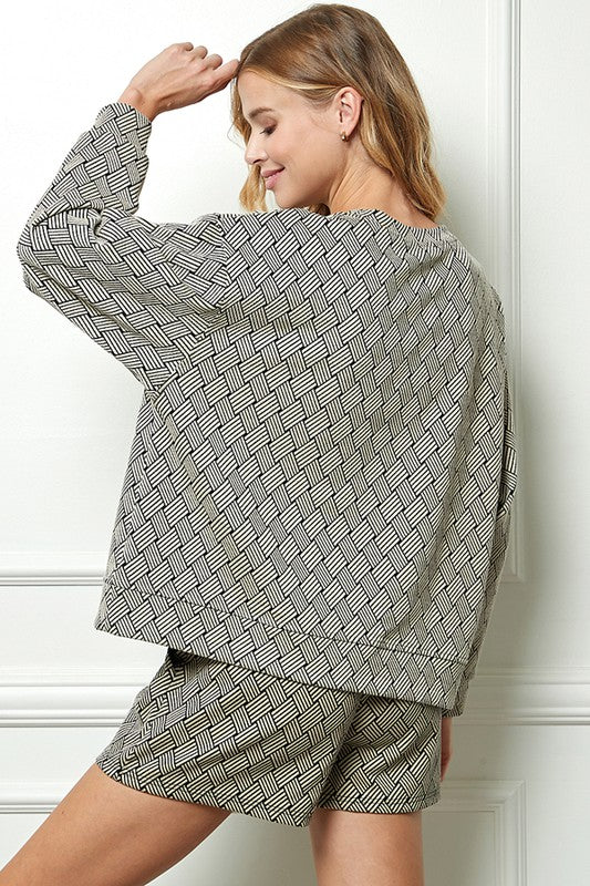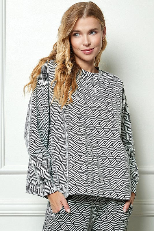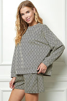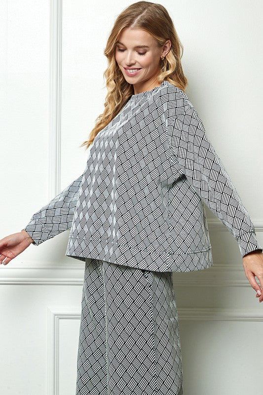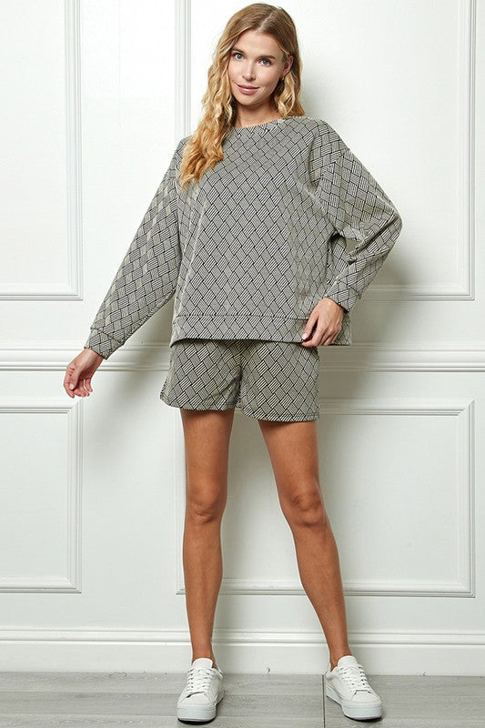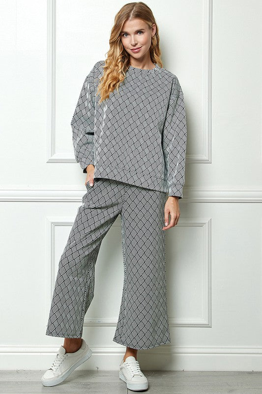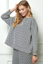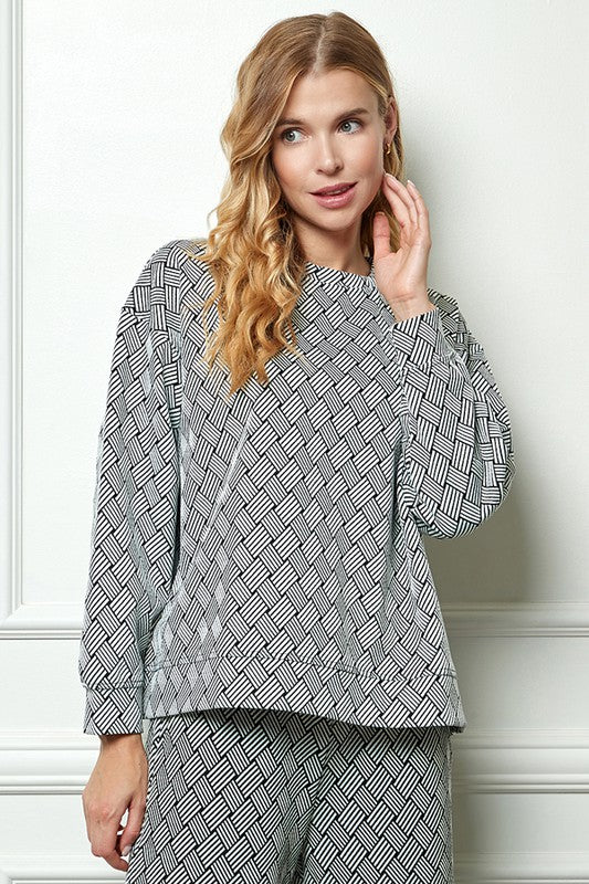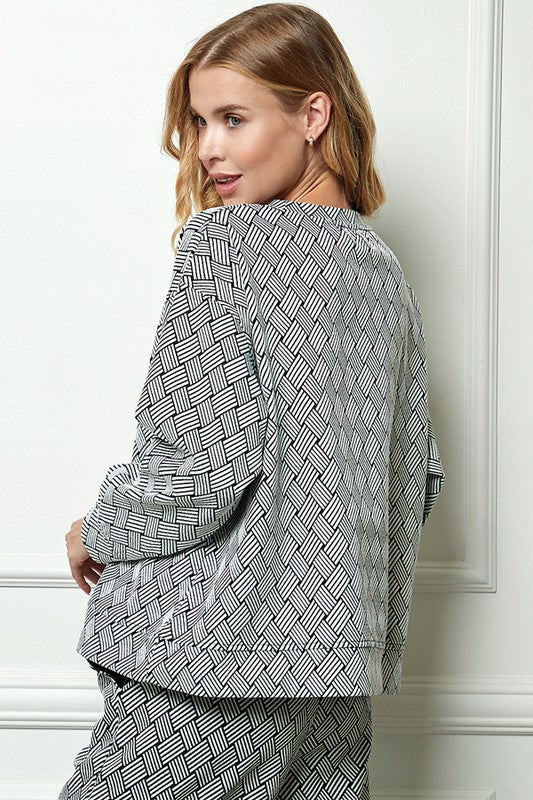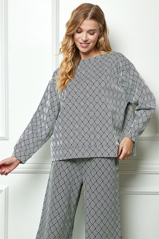 Elevate your loungewear with this textured long sleeve top that effortlessly blends comfort and style. Featuring a striking black base with a classic checkered pattern, each square showcases vibrant color stripes for visual interest and dimension. The soft, textured fabric drapes beautifully while the long sleeves provide cozy coverage perfect for relaxing at home or casual outings. A versatile piece that transitions seamlessly from day to night, this lounge top pairs easily with your favorite bottoms for an instantly polished look.
